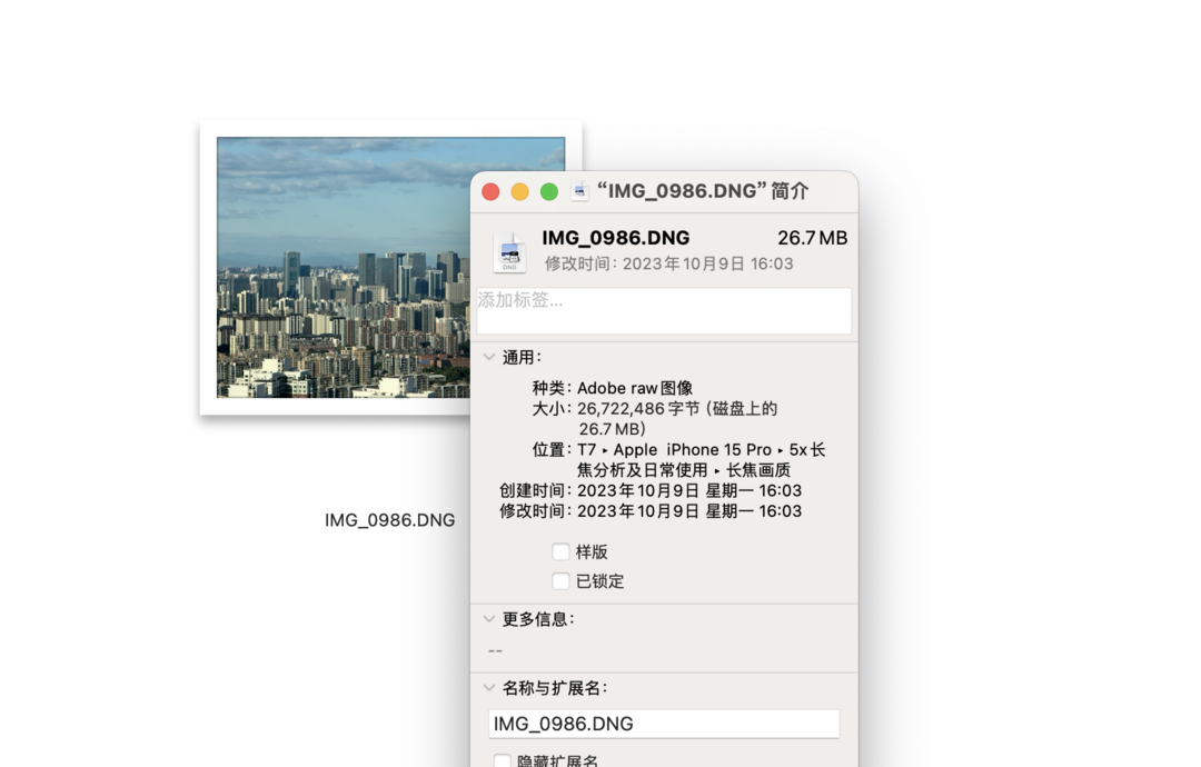使用iPhone15ProMax的长焦镜头拍摄的RAW照片输出分辨率为1200万像素,RAW照片的尺寸达到了26.7MB,相比于接近100MB的主摄4800万像素照片要小了不少。