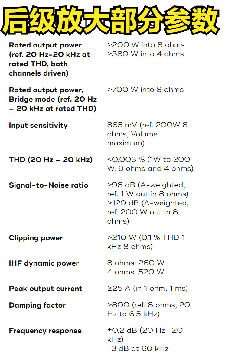 很明显,这个参数表就是综合的了,他指出这台功放有200W一个声道的推力,用了最新的HybridDigitalPurifiEigentakt™这一数字放大技术。