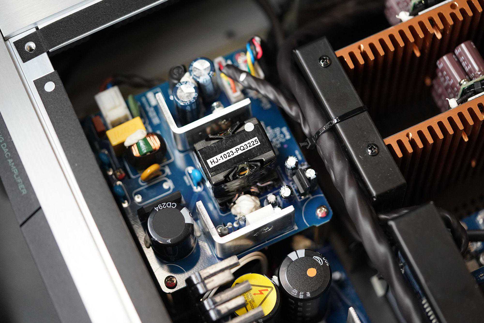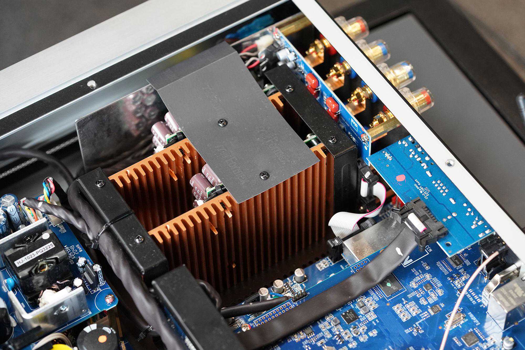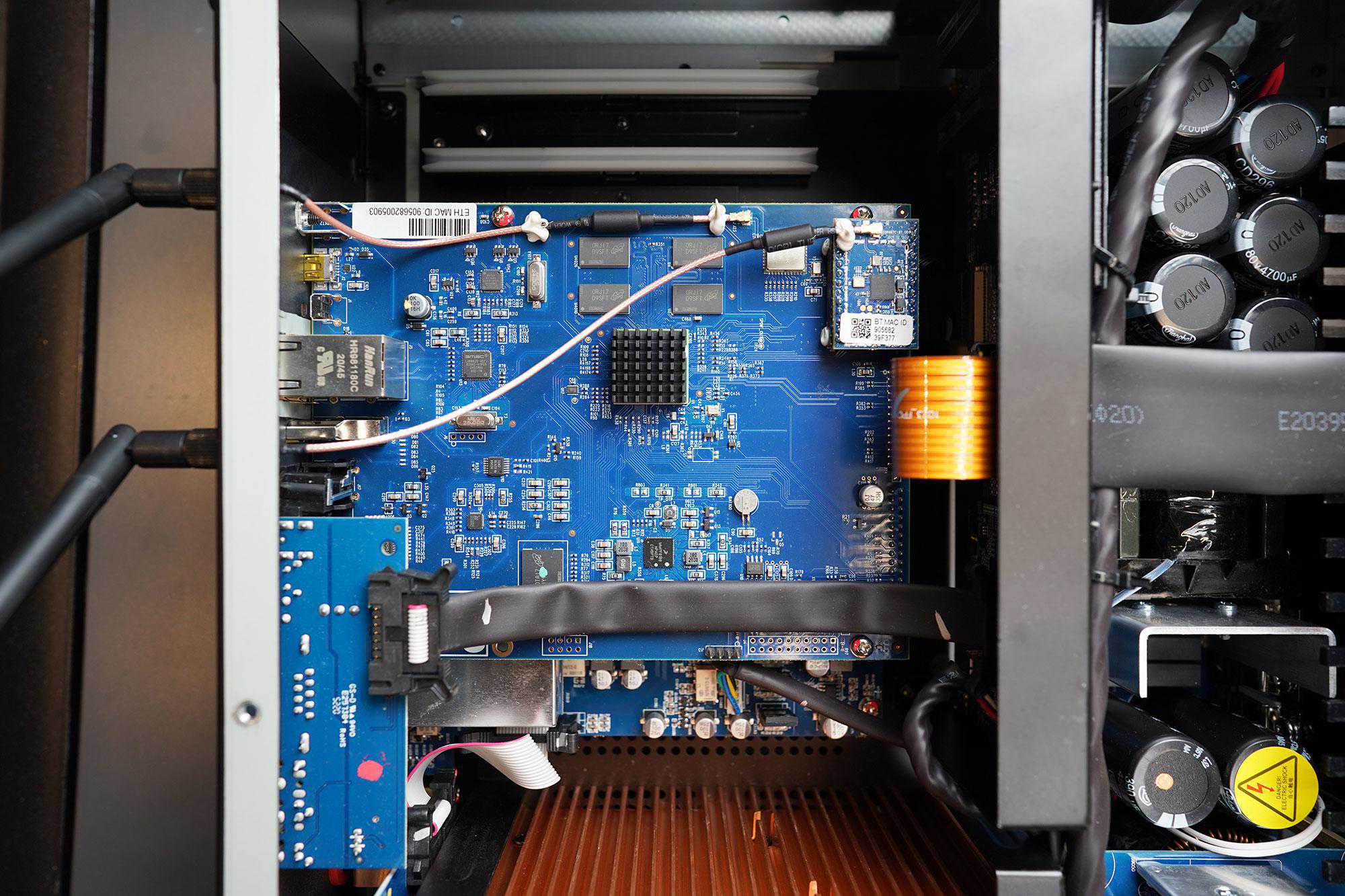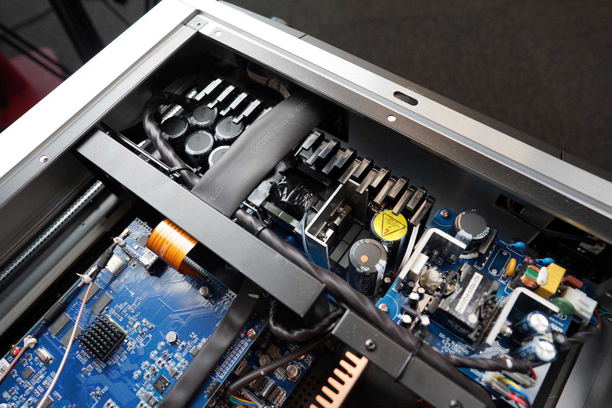 这里面分为了三大块,最重要的当然就是PurifiIET400AEigentakt这一全新的数字放大模块,而最上面靠近前面板的是电源供应,而左边蓝色的PCB是DAC、前级和BluOS系统那一大堆。