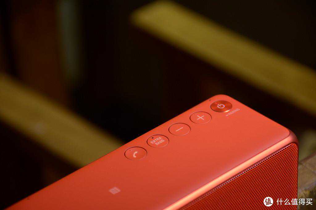按键从左到右一次是通话按键、extrabass重低音模式、音量减、音量加,以及开关/蓝牙配对键。