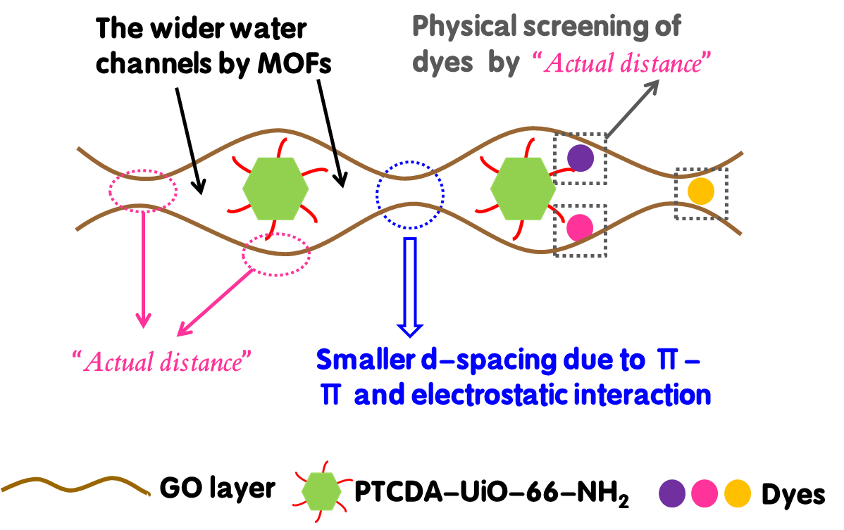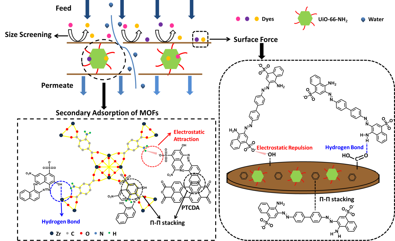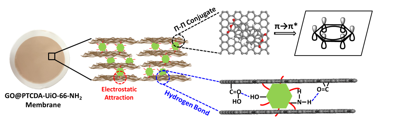 为了解决上述问题,一些研究人员往往倾向于在GO的层间距中插入一些大尺寸的材料。UiO-66-NH2是一种具有稳定化学和物理性质的多孔金属有机骨架(MOFs)材料,相关工作已将其成功添加到GO膜中。然而,UiO-66-NH2与GO片之间几乎没有相互作用力,导致制备的UiO-66-NH2@GO膜的结构和性能不稳定。苝四甲酸二酐(PTCDA)是一种类似于GO的多苯环排列的小分子,可与GO片产生强Π-Π共轭,这提供了一种在GO层间距之间锁定UiO-66-NH2的新方法。在这项工作中,将PTCDA-UiO-66-NH2插入到GO的层间距中以制备GO@PTCDA-UiO-66-NH2复合膜如图1。PTCDA和GO之间的Π-Π共轭提供了MOFs和GO的结合力,缩小了层之间的实际过滤通道,并促进了染料的去除如图2和3。此外,PTCDA-UiO-66-NH2的插入产生了新的有利于水传输的结节结构,PTCDA-UiO-66-NH2还可以横向吸附染料分子,这得益于其大的比表面积和PTCDA与染料之间的Π-Π堆积,实现了染料的二次去除如图4。这完美地实现了大尺寸材料与小分子的结合,为膜领域提供了新的发展前景。