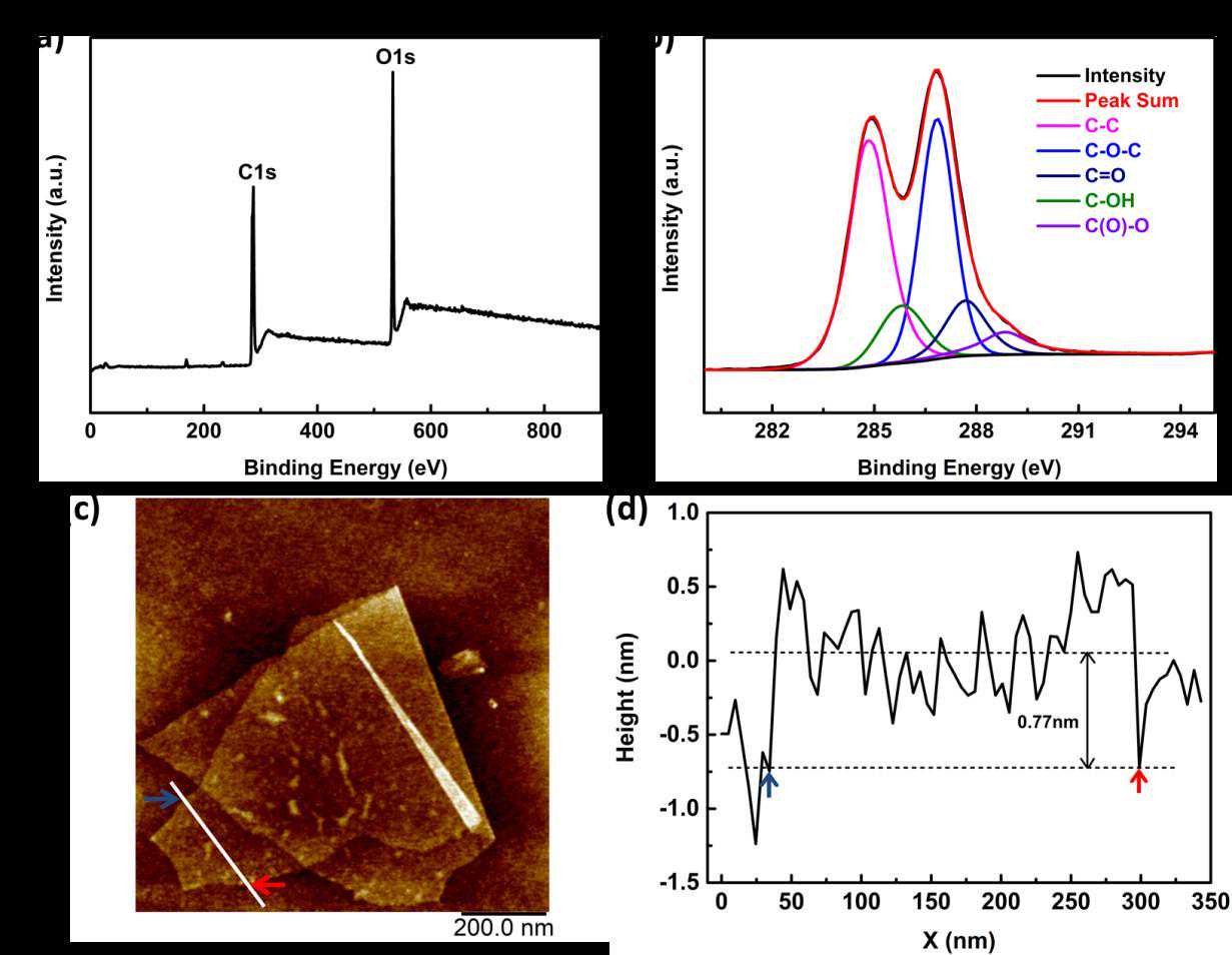 图5.XPS光谱(a);C1s光谱(b);AFM图像(c)和单片GO的切片厚度(d)。