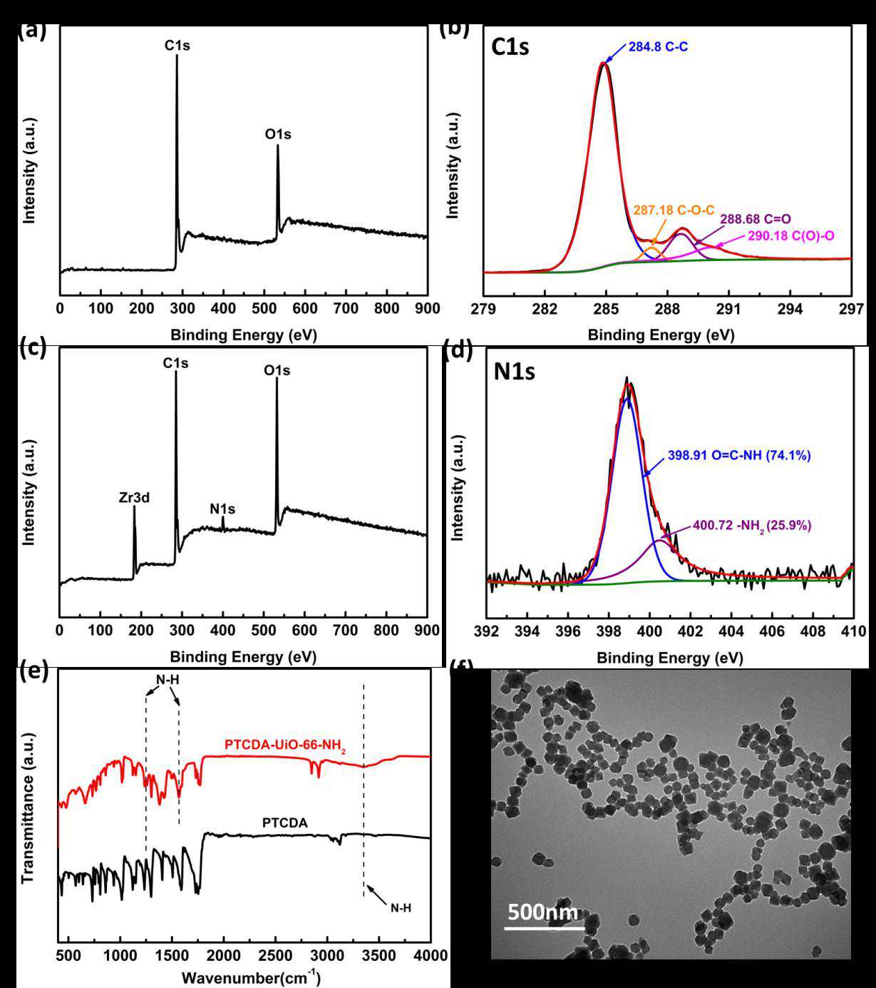 图6.PTCDA的XPS测量光谱和C1s光谱(a,b);PTCDA-UiO-66-NH2的XPS测量谱和N1s谱(c,d);PTCDA和PTCDA-UiO-66-NH2的FTIR光谱(e);PTCDA-UiO-66-NH2的TEM图像(f)。