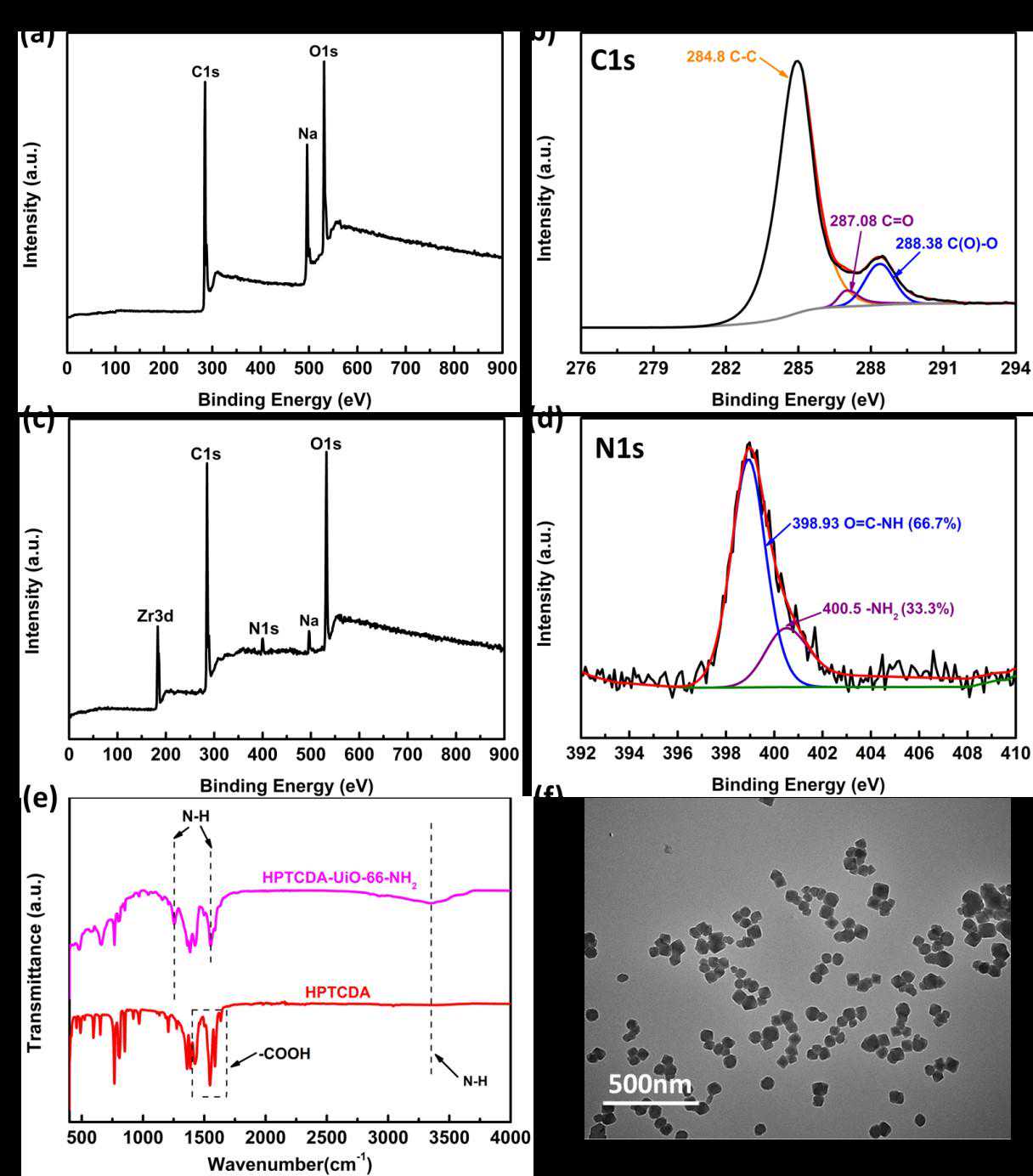 图7HPTCDA的XPS测量光谱和C1s光谱(a,b);HPTCDA-UiO-66-NH2的XPS测量光谱和N1s光谱(c,d);HPTCDA和HPTCDA-UiO-66-NH2的FTIR光谱(e);HPTCDA-UiO-66-NH的TEM图像(f)。