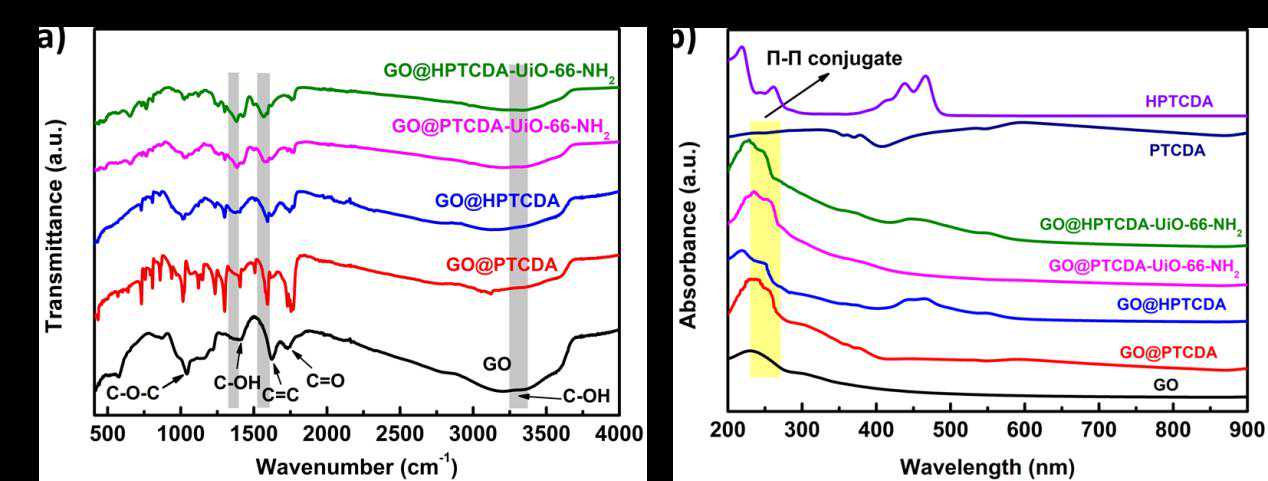 图8GO、GO@PTCDA、GO@HPTCDA、GO@PTCDA-UiO-66-NH2、GO@HPTCDA-UiO-66-NH2的FTIR光谱(a);PTCDA、HPTCDA、GO、GO@PTCDA、GO@HPTCDA、GO@PTCDA-UiO-66-NH2、GO@HPTCDA-UiO-66-NH2的紫外-可见光谱(b)。