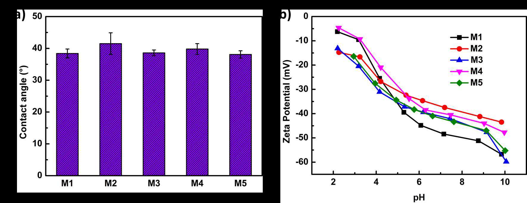 图11.制备的膜在不同pH值下的水接触角(a)和Zeta电位(b)。