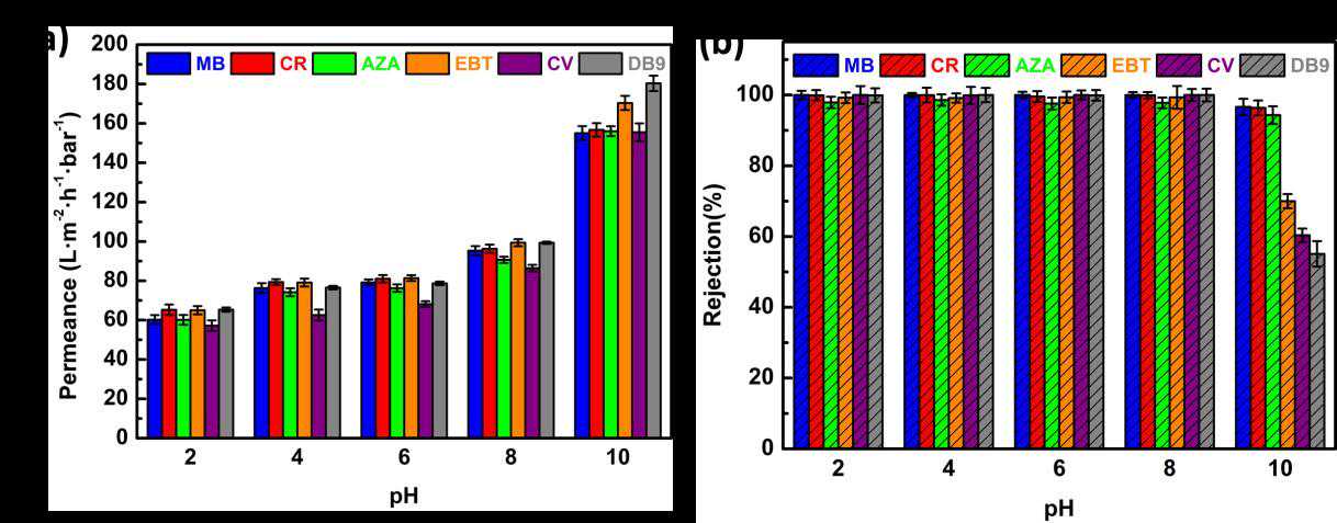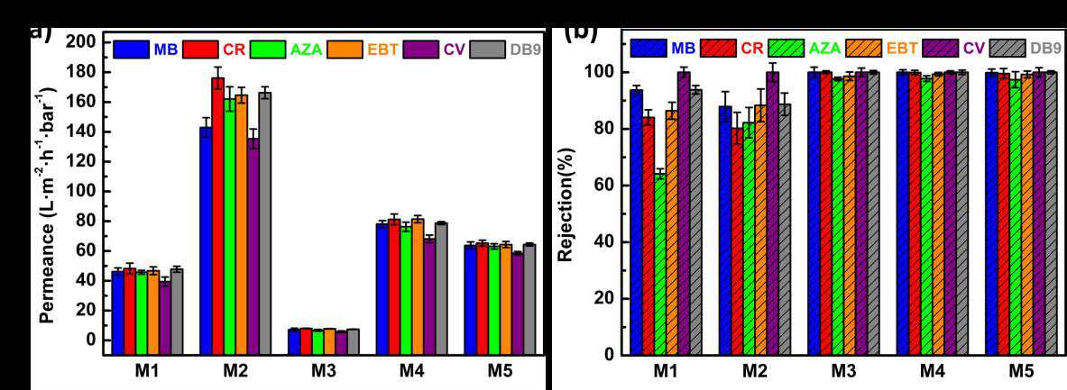 图12.制备的膜对甲基蓝(MB)、刚果红(CR)、子种绿A(AZA)、铬黑T(EBT)、结晶紫(CV)和分散黑9(DB9)废水的渗透率(a)和截留率(b)。