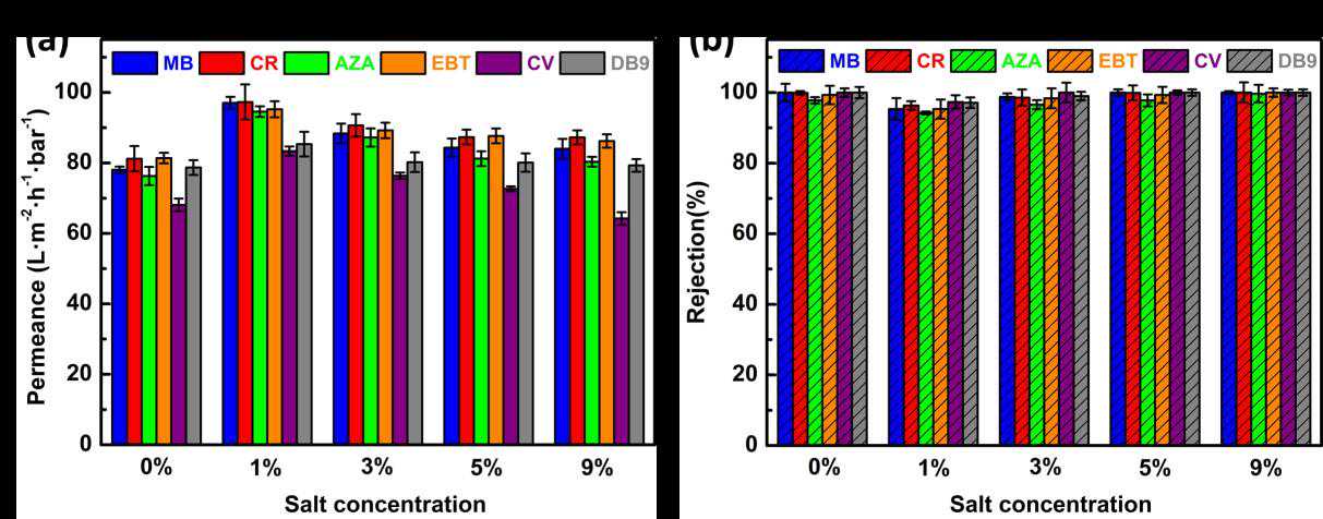 图13.随着盐浓度的增加M4的渗透率(a)和截留率(b)。