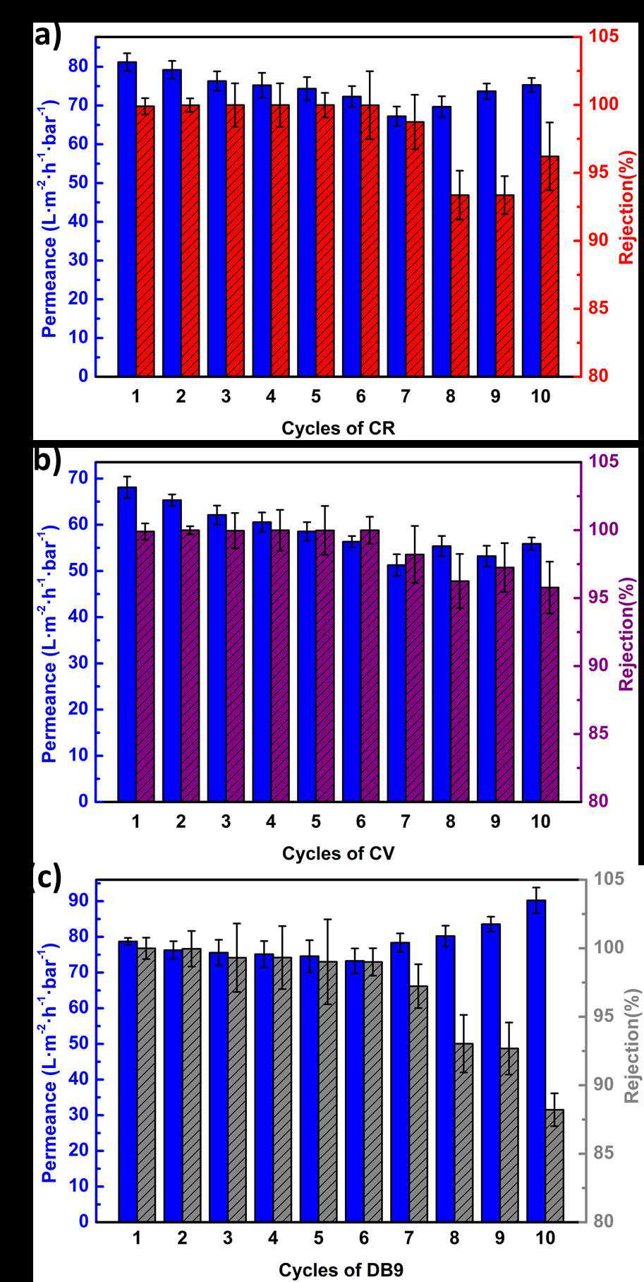 由于染料废水含盐量和pH不确定性,分别研究了不同盐浓度和pH值下M4的透水率和截留率,如图13(a、b)所示。M4的渗透性能具有显著的耐盐性。在图14(a、b)中,M4在2~8的pH范围内对6种染料表现出良好的去除率,表明在较大的pH跨度下膜的分离性能稳定。考虑到经济性,膜的回收性能非常重要。如图15所示,以CR、CV和DB9作为模拟废水污染物对M4进行循环实验。实验表明,M4在6个循环内对三种染料保持接近100%的去除率,而由于染料在M4表面的吸附污染,渗透率略有降低。由于多次循环清洗引起膜膨胀,在循环实验后期M4的去除率下降。特别是对于不带电荷的DB9,它很少与M4发生吸附行为,因此膜溶胀导致其截留率持续下降。同样,它也不易粘附在M4的表面,其渗透性显着提高。对于带电染料CR和CV,它们与M4之间的相互作用填补了膜溶胀引起的结构松弛。10个循环后,CR和CV的拒绝率始终分别高于93%和95%。总体而言,M4在过滤染料废水方面具有一定的可回收性。