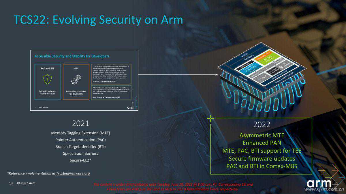 TCS22在安全性方面引入了对非对称MTE(内存标记扩展)的支持,属于去年TCS21首发对称MTE的扩展。记忆体区域和相关指标会标记为相同的标签,并由CPU检查是否相符。如果存在差异,则CPU会停止处理。对于不对称MTE,CPU可以在装载命令期间更新触发器,而在内存命令期间异步更新内存区域。