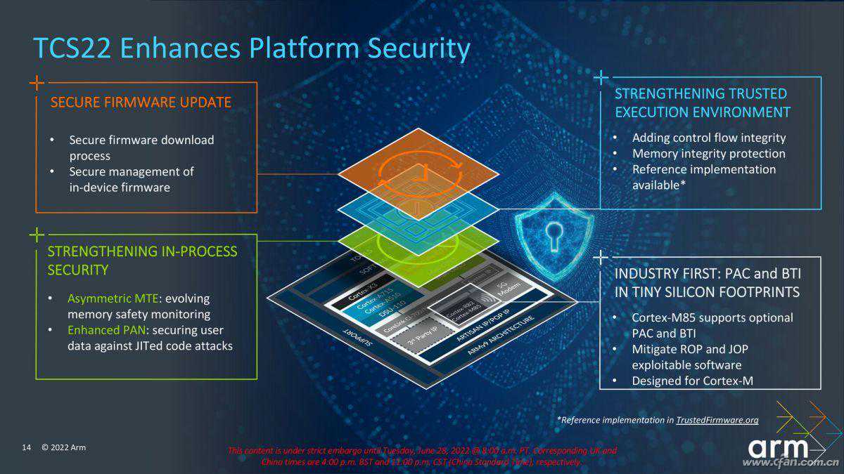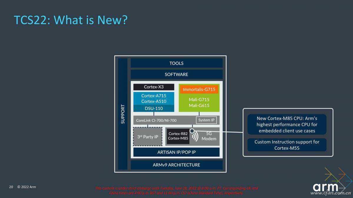 TCS22中使用的CoreLinkCI-700相干互连技术和CoreLinkNI-700片上网络互连技术没有什么变化,但针对台积电和三星最新的4nm、5nm工艺进行了特殊的优化,支持连接Cortex-M85,用于嵌入式解决方案,如智能扬声器或作为全天候处理器,使用DSP和机器学习功能来处理智能手机上的语音命令。此外,ARM还未开发者提供了方便的开发平台及工具VFP,可以更好地仿真测试等等。