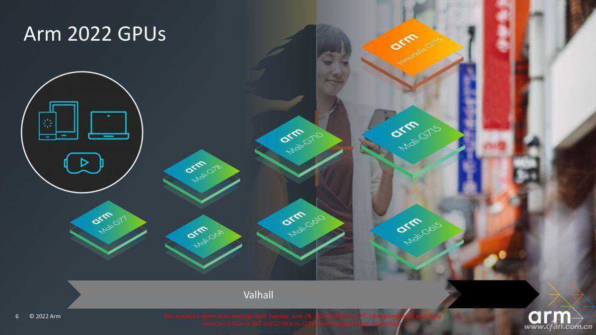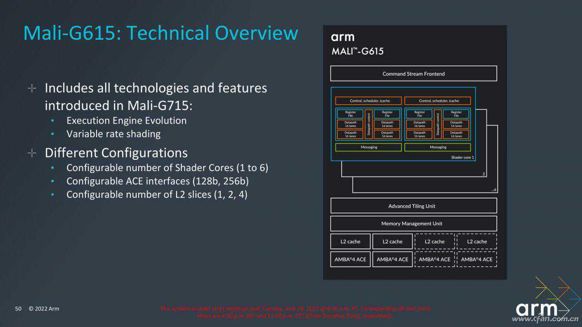 Mali-G715和Immortalis-G715的差别是不含RTU,可选7~9个计算单元。Mali-G615的计算单元数量下降到1~6个,性能垫底。