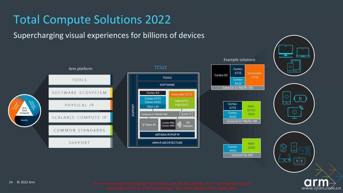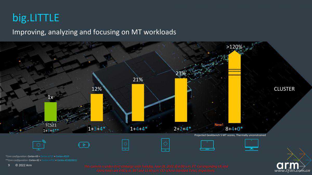 ARM为TCS22,也就是Cortex-X3、Cortex-A715和Cortex-A510Refresh准备了优化的DynamIQ技术以及全新的动态共享单元DSU-110,最多可以实现8(X3)+4(A715)+0(A510Refresh)共计12核心设计,满足顶级游戏手机、平板电脑甚至PC对性能的苛刻要求。此外,还能实现1+4+4和2+2+4等核心组合。