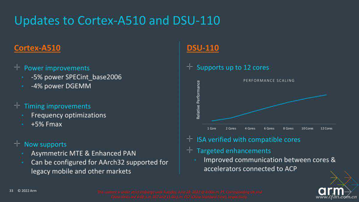 作为新一代的小核,Cortex-A510Refresh依旧注重更好的能效,和上代产品相比在相同性能时可以减少5%左右的能耗。