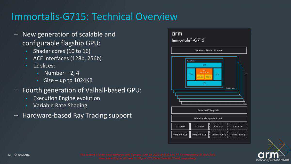 Immortalis-G715、Mali-G715和Mali-G615都采用第四代Valhall体系结构,它们之间的差异只是着色器的配置和计算单元数量不同。其中Immortalis-G715定位旗舰,也是家族唯一硬件支持光线追踪技术的GPUIP,最多可以搭配16个RTU,可选10~16个计算单元。