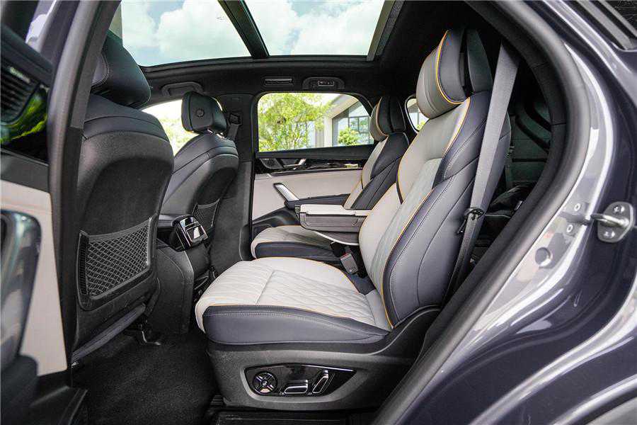 座椅部分,比亚迪唐DM-p标配了“2+3+2”的7座布局,当然也可以花钱选装“2+2+2”的6座布局。如果是6座版本,比亚迪唐DM-p不仅升级了麂皮材质的苍穹灰内饰,而且第二排座椅还支持电动调节、加热、通风。另外,第二排还有双杯架和双USB充电口,头枕侧翼也可以进行调整。所以从这里也能够看出来,比亚迪唐DM-p的6座版本可以兼顾一定的商务需求。