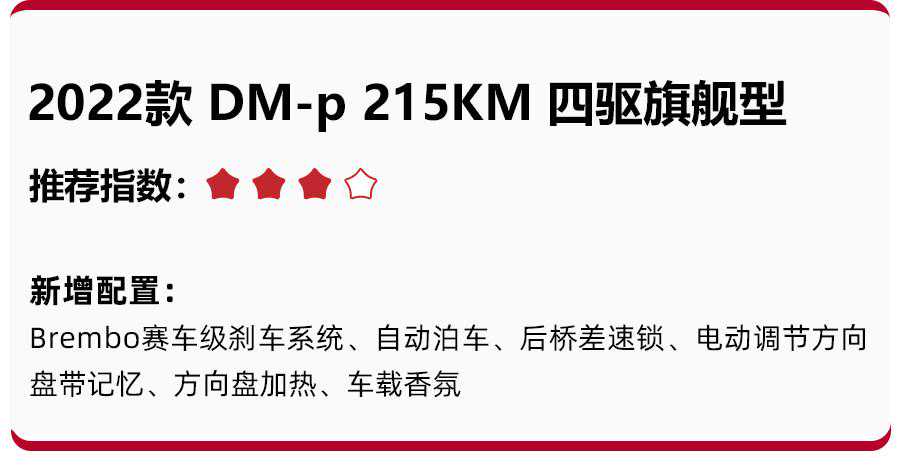 在这里我先给出购买建议:首推大家选择指导价28.98万元的DM-p215KM四驱尊贵型。