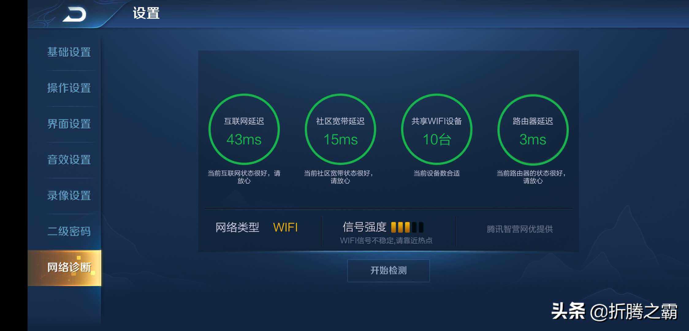 在王者荣耀设置网络诊断中信号强度只有黄色三格,游戏中是否能保持流畅呢?每1分钟截图一次,游戏结束后统计延时数值。