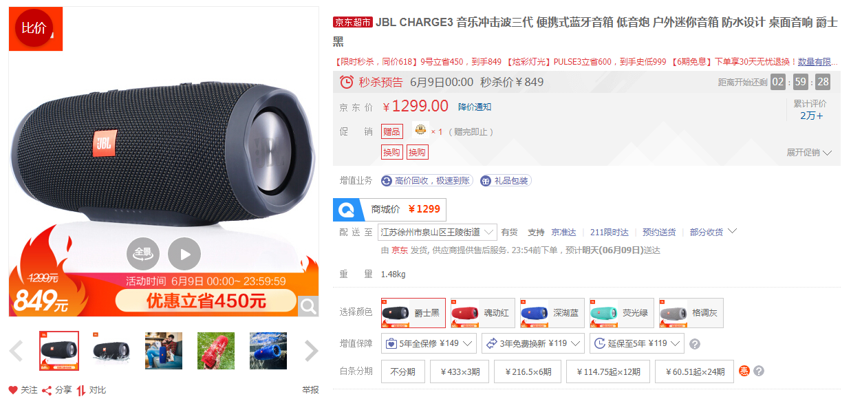 JBLCHARGE3平时的价格大概1000元出头,618期间价格为849元。虽然这款音响目前的优惠幅度不是很大,但性价比还是有的。