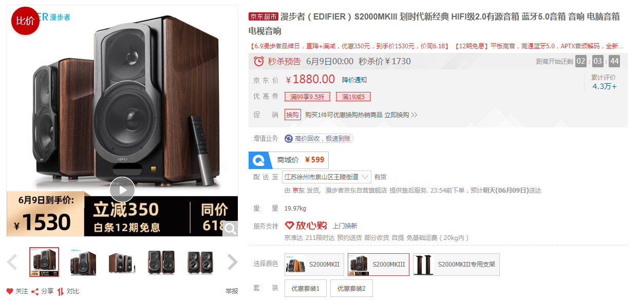 漫步者S2000MKIII平时价格为1880元,618期间价格为1530元。不得不说,漫步者的这两款音响相对于众多海外品牌来讲性价比真的是蛮高。