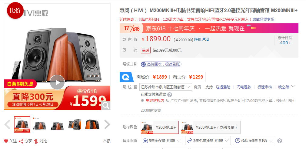 惠威作为漫步者的多年宿敌,618的优惠当然也会加大力度。惠威M200MKIII+平时的价格为1900元左右,618期间价格为1599元。