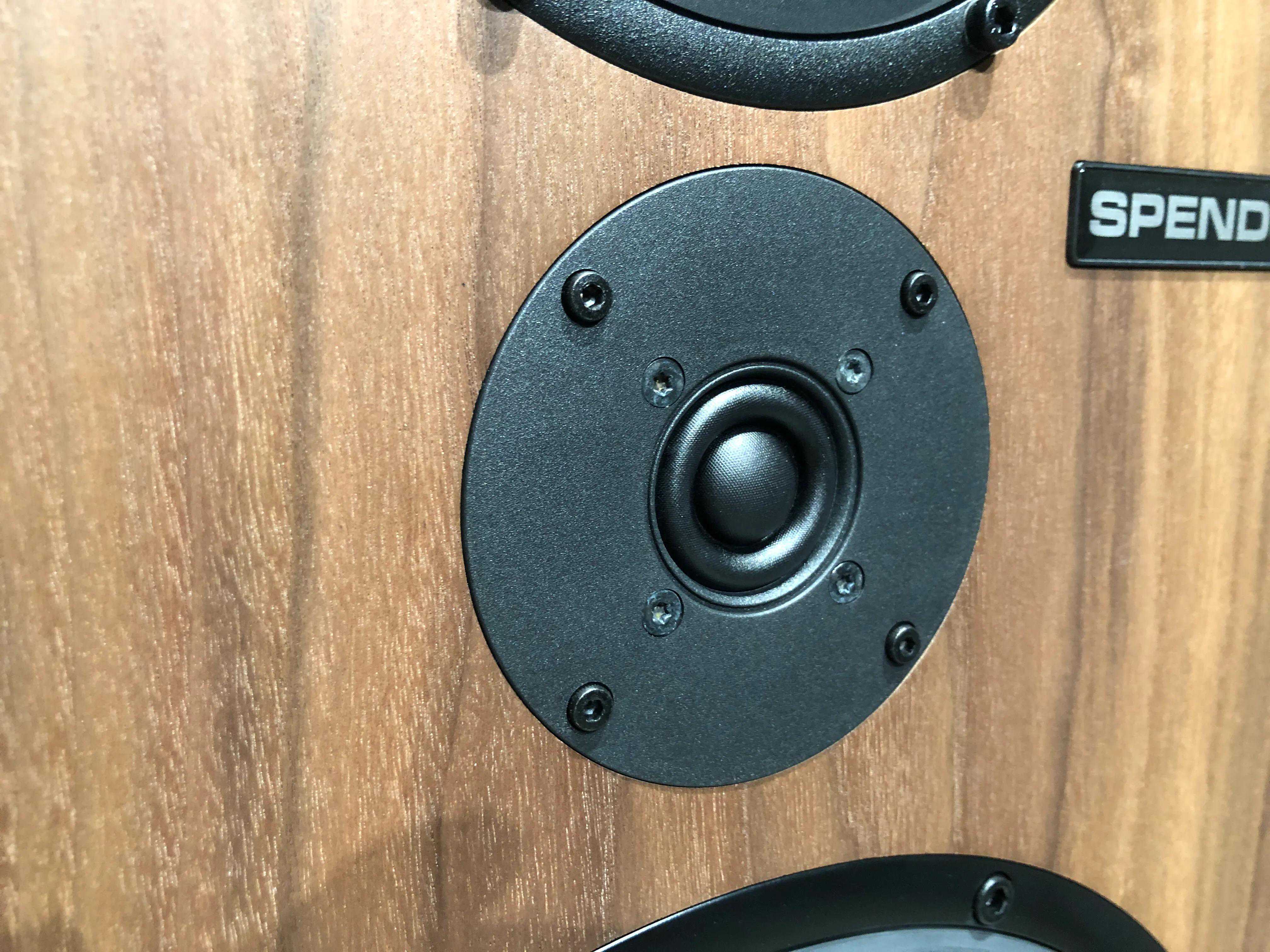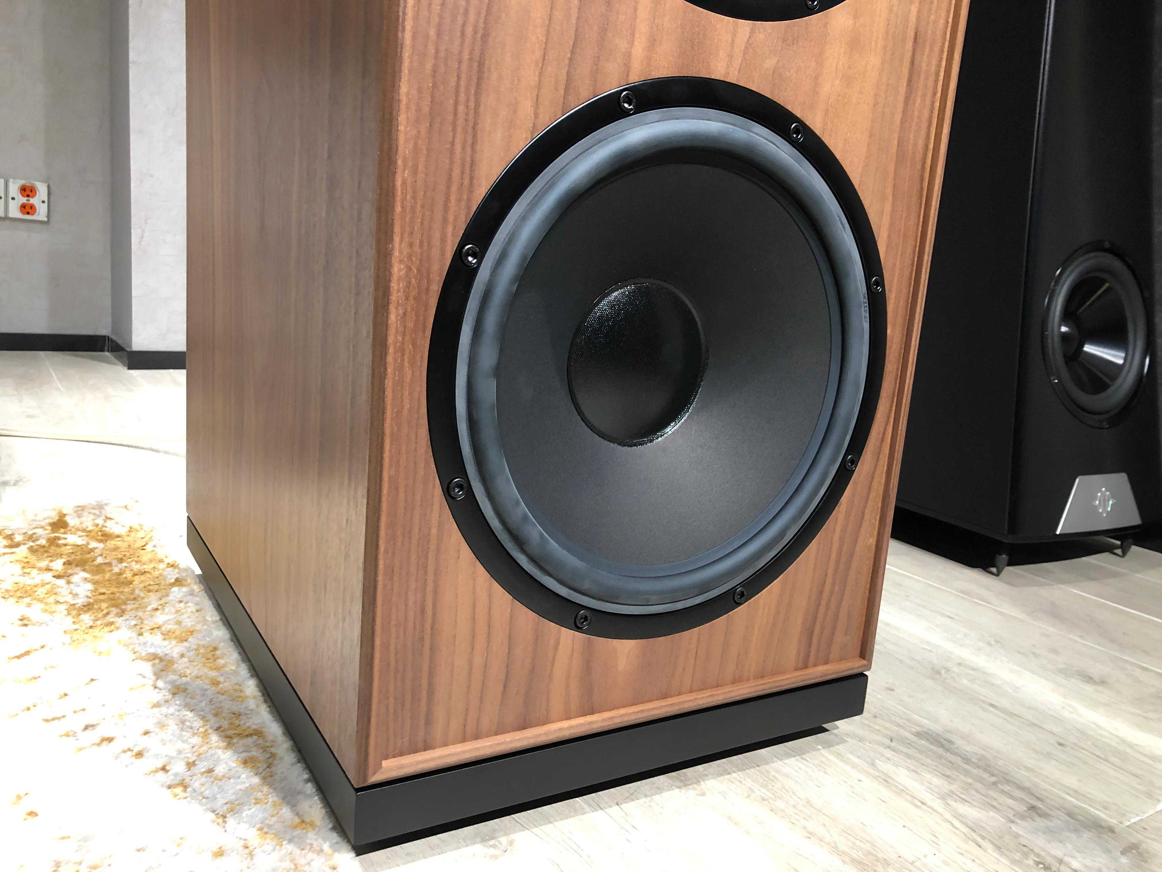 高音单元下面是两只12寸低音单元,镁合金铸造框架,杜邦凯夫拉芳纶纤维制作振盆,没有使用以前聚苯乙烯材料,凯夫拉纤维有着密度低,强度高,韧性好,耐高温,易于加工成型,其强度是钢铁5倍,但重量只为钢铁1/5,真是刚柔相济。振盆中央加入半球形防尘罩,一可防尘,二可改善气流,减少风噪声,使单元发出干净声音。升级磁铁驱动系统,使磁性更稳定,两只低音单元负责550Hz-20Hz频率范围。中低音单元是思奔达自家设计生产,没有借助他人之手,确保质量稳定性。分频器部分进行重新设计,使频点衔接更连贯,相位失真更低,3路4单元,阻抗8欧姆,密闭式设计,空气作阻尼,使声音达到更好分析力,低频速度感与层次感更好,密闭式比后倒相孔也更容易摆位,这对箱子灵敏度89分贝,使音箱更容易搭配到功放。
