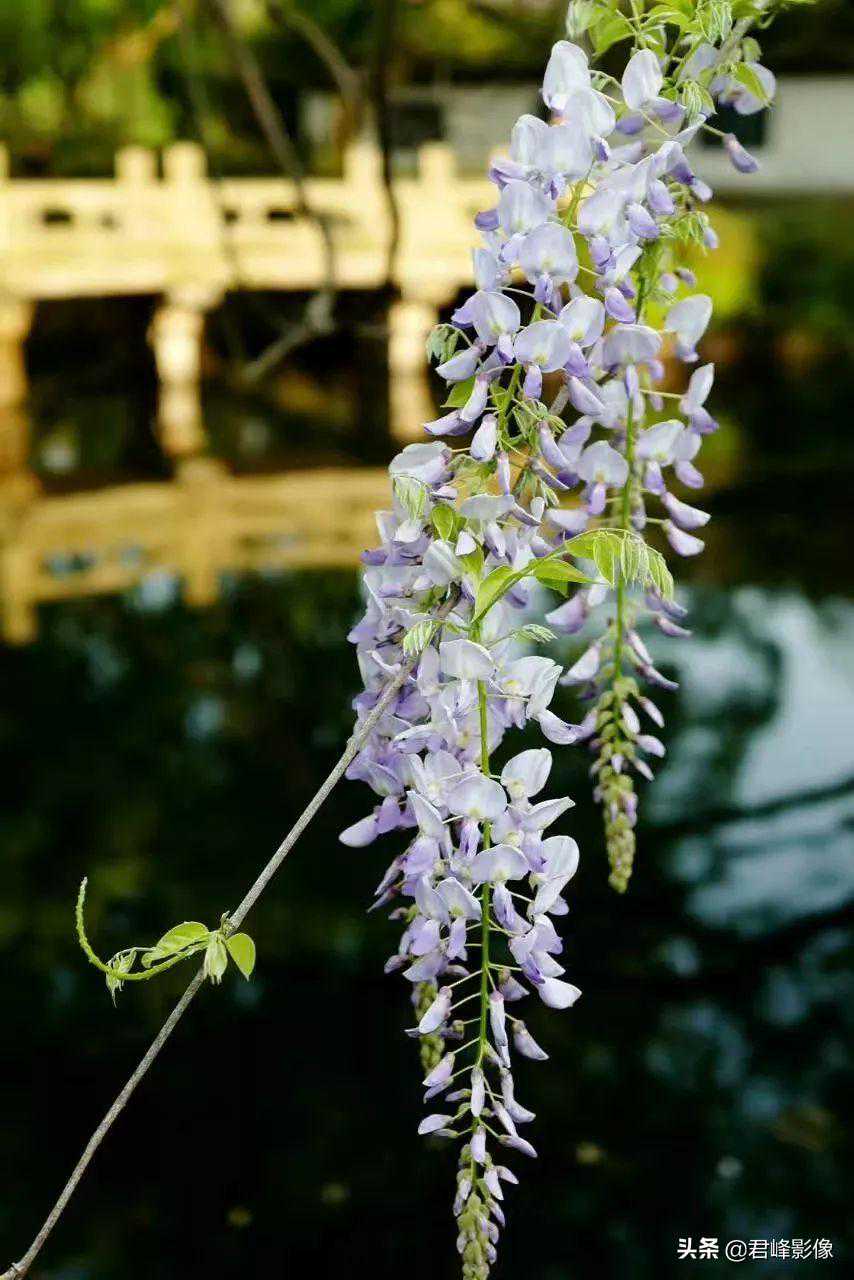 春暖花开,生机勃勃。上海嘉定紫藤园内,满园紫藤花开,独有一枝垂技直下湖面,一瞬间留下美照,远处隐约古桥衬托湖中,煞时好看。~LEICAQ