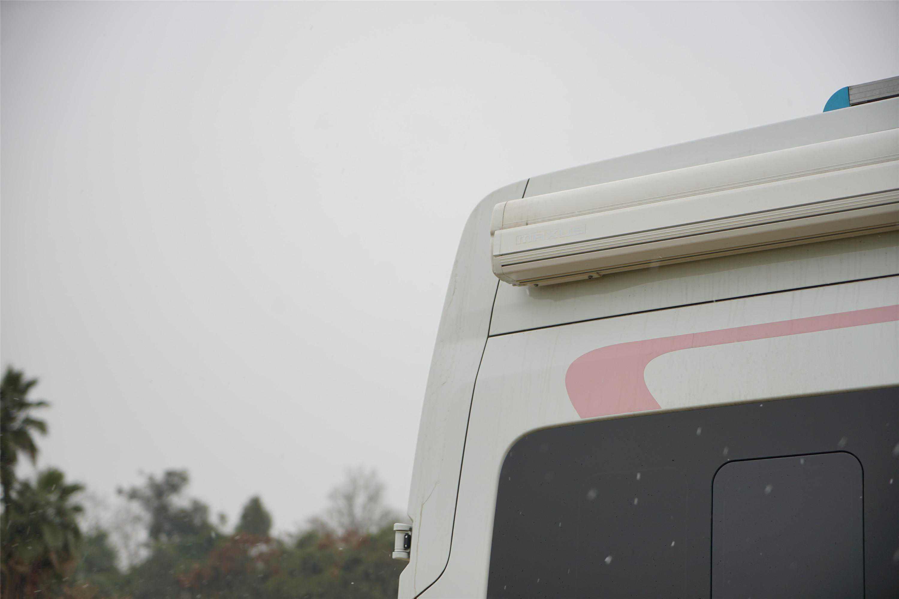 车身右侧配置户外遮阳棚、重力加水口、外置抽拉厨房。