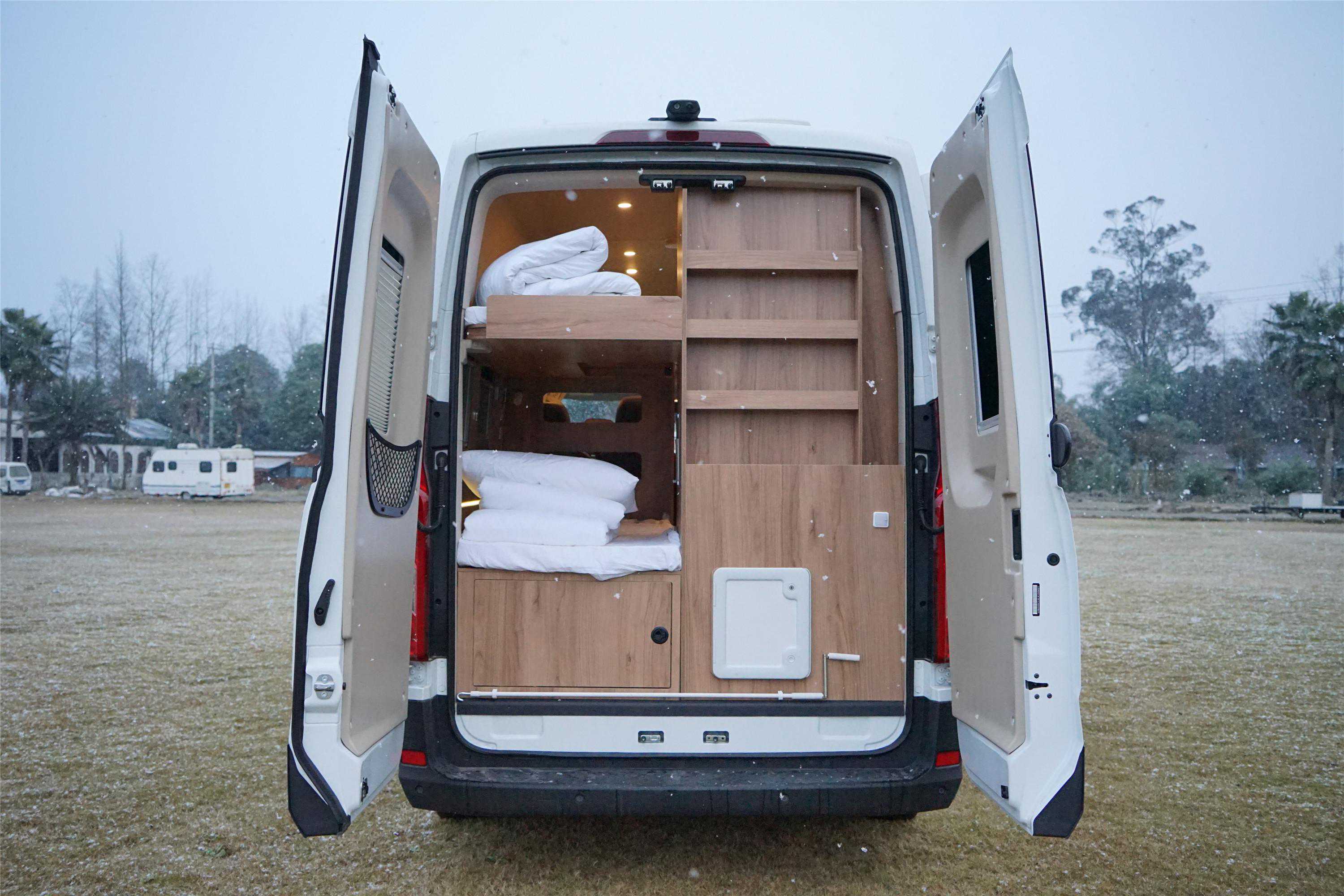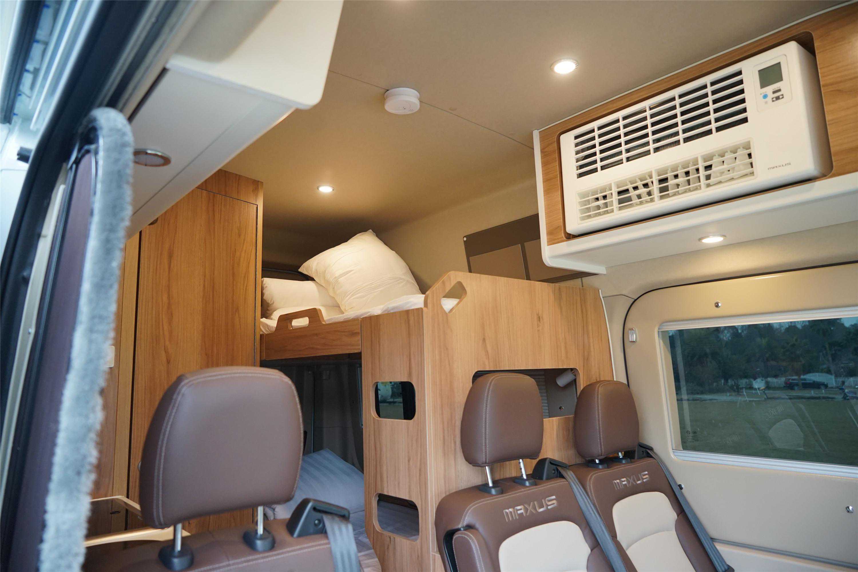 上汽大通MAXUS旅行家V90是目前市场上室内空间使用率较佳的车型,生活区的内部长宽高大概为3400*1800*1980mm,空间宽敞不压抑。这个版本核载5人,床位包含卡座变床及纵置上下铺,最多可同时容纳4人休息。