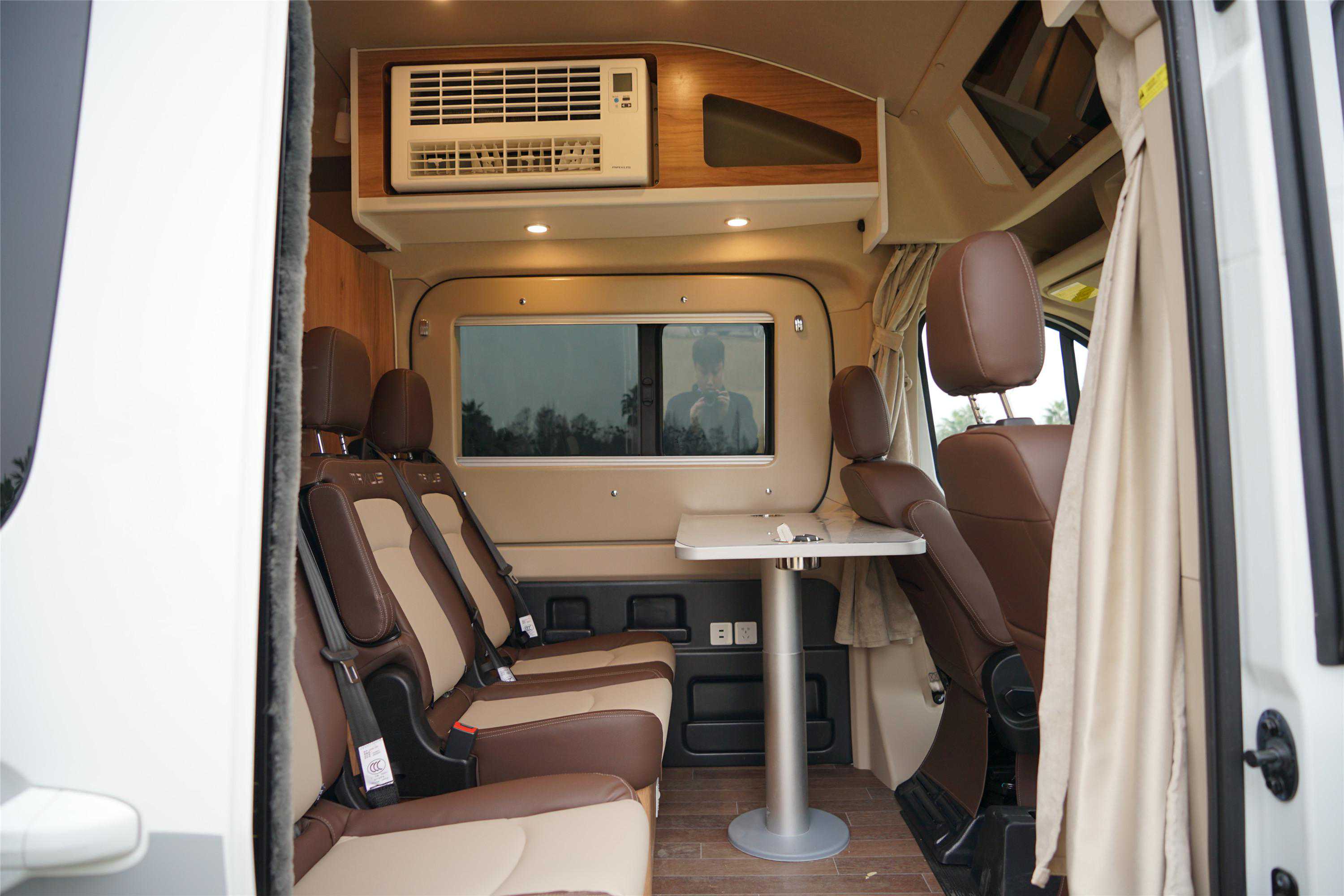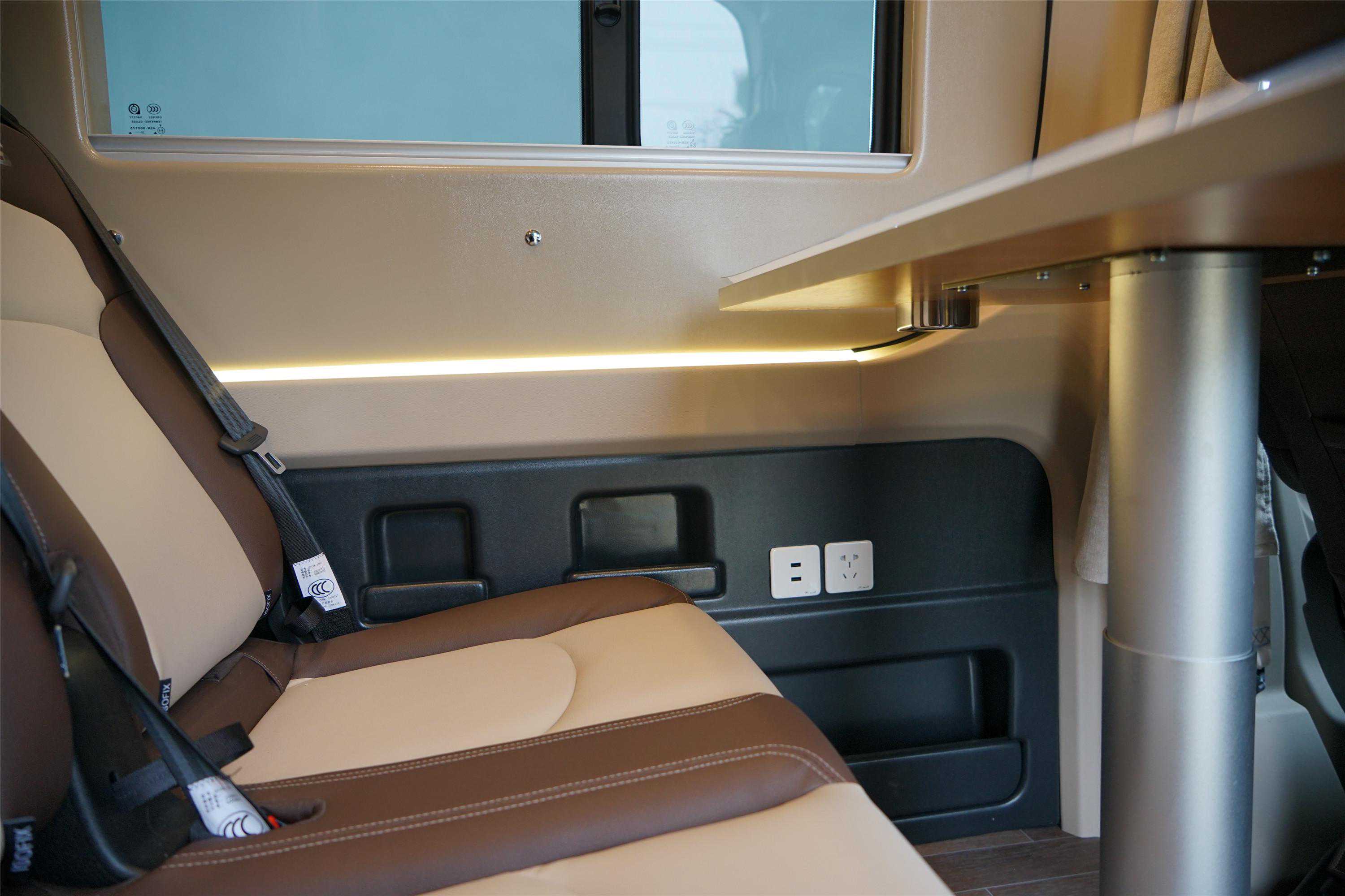 第二排为3个独立座椅,均满足M1类乘用车座椅标准,舒适性及安全性更有保障。中部餐桌带电动升降,降下以后可以配合座椅及床垫拼成临时床位,尺寸大概为1800*1150mm。