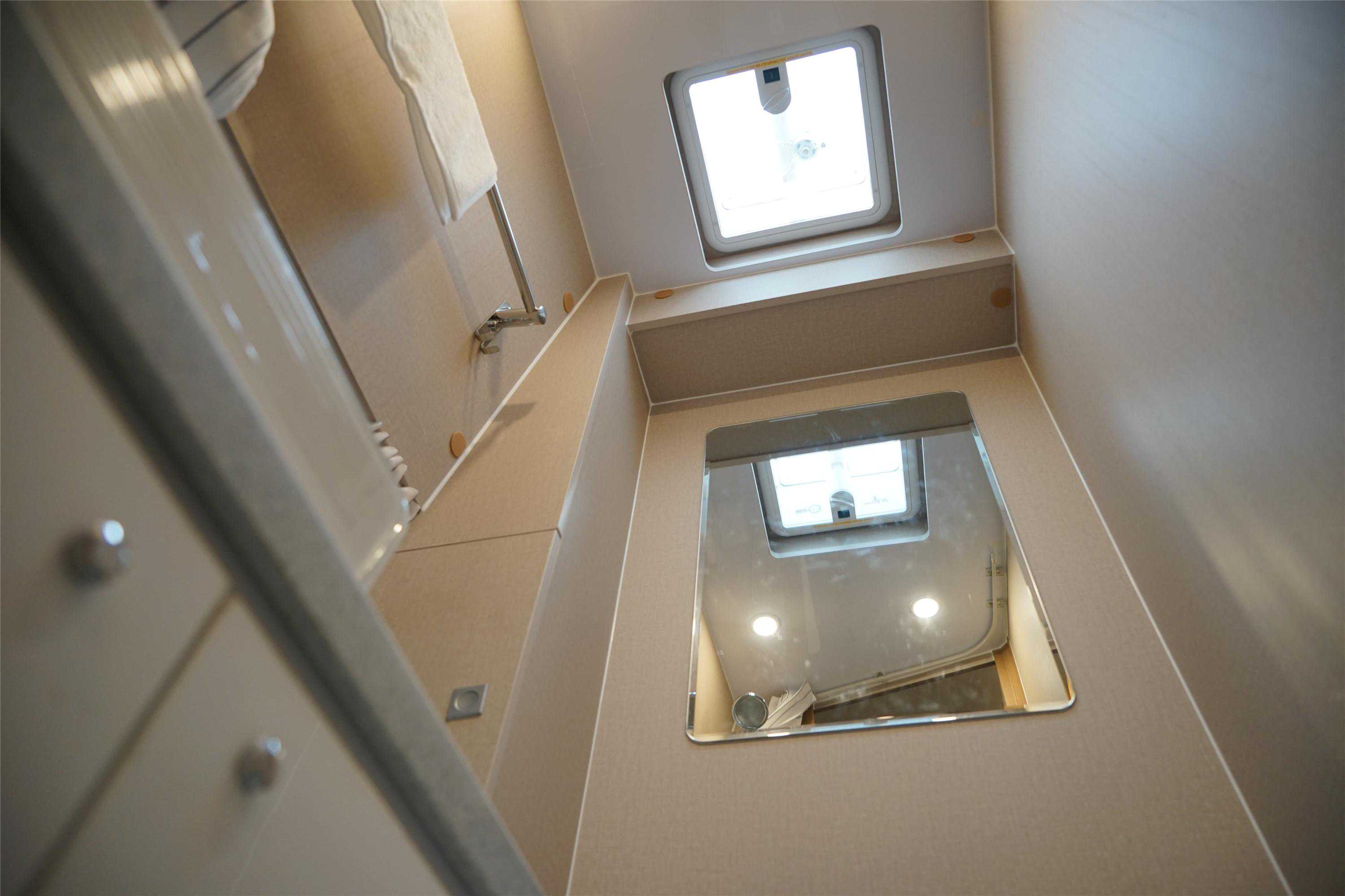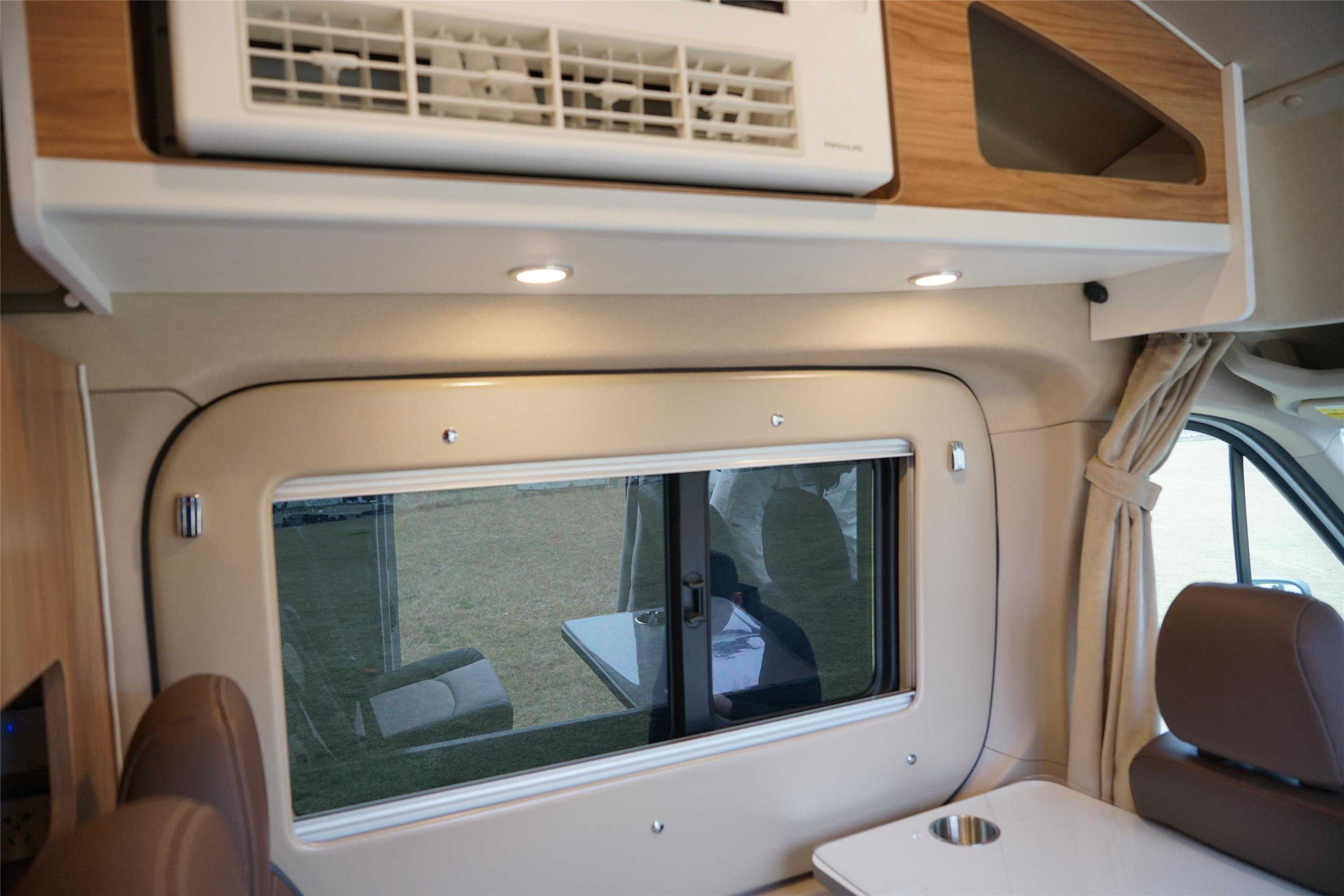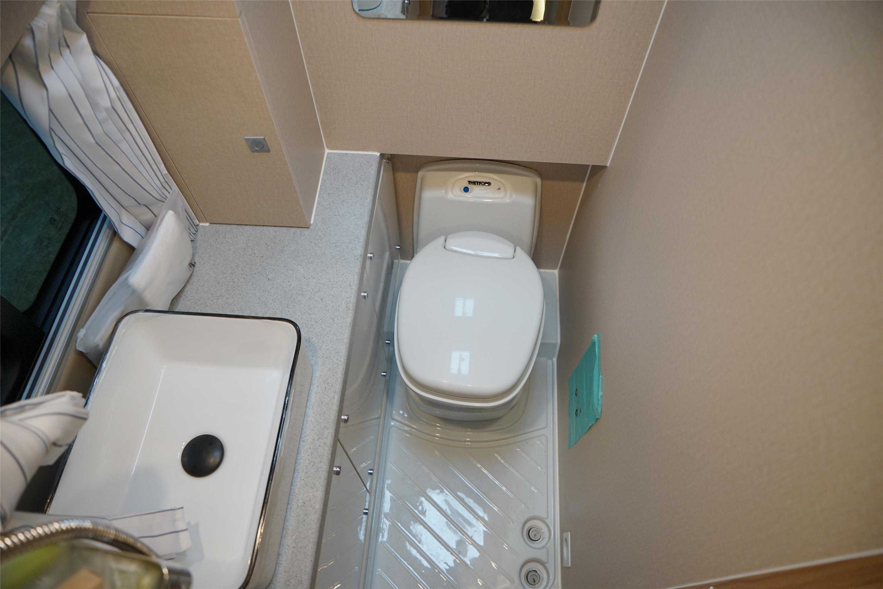采用一体式开模卫生间,是同级别车型中最大尺寸卫生间,达到高度1830mm、进深900mm、宽度800mm。另外,设计布局规整,所以显得更为宽敞。内置赛特福德带旋转盒式马桶、水池、独立淋浴、外推窗、双向换气扇、梳妆镜、储物格等,且底部配有2个地漏,避免出现积水的尴尬。