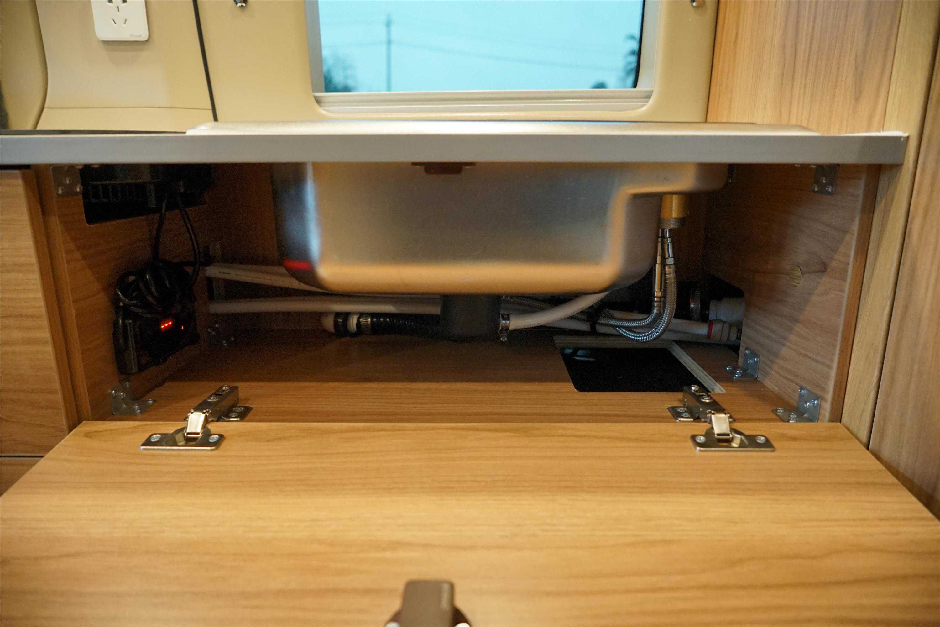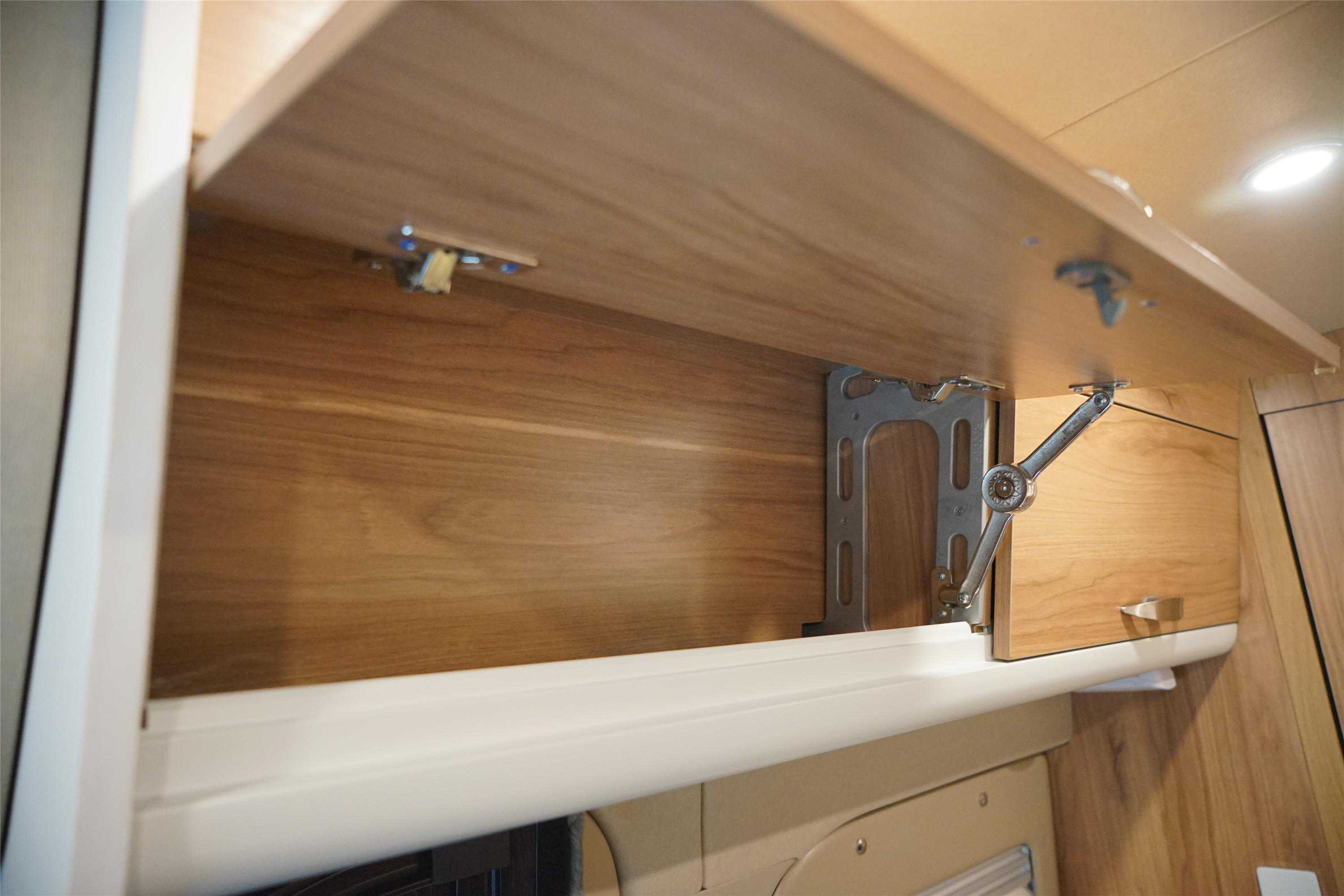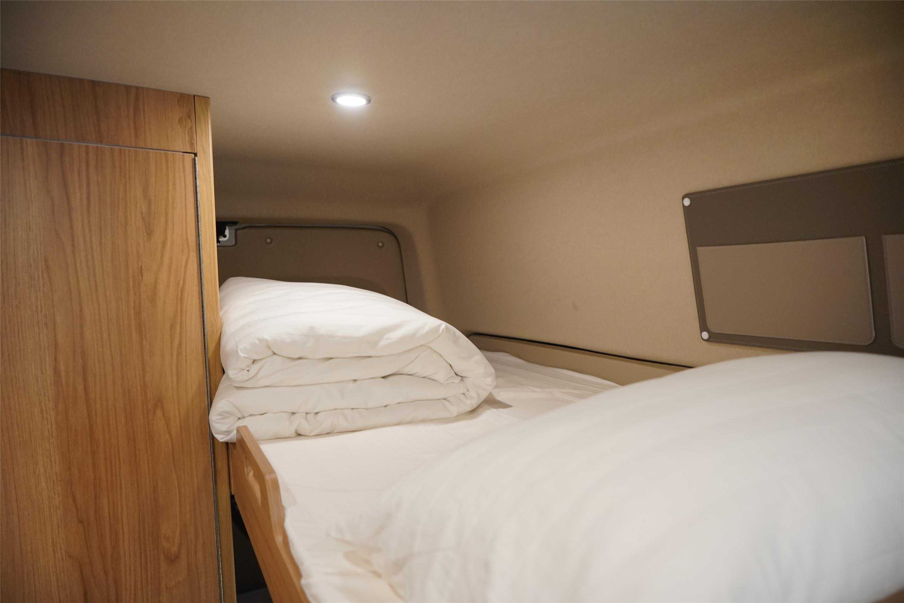 车内属于纵置上下铺的设计,下铺的下方为储物空间,长宽高分别为1240*880*440mm,容积大概为480升。右侧是室内卫生间的背板,上部设计了三层储物格,下部是赛特福德盒式马桶黑水箱。