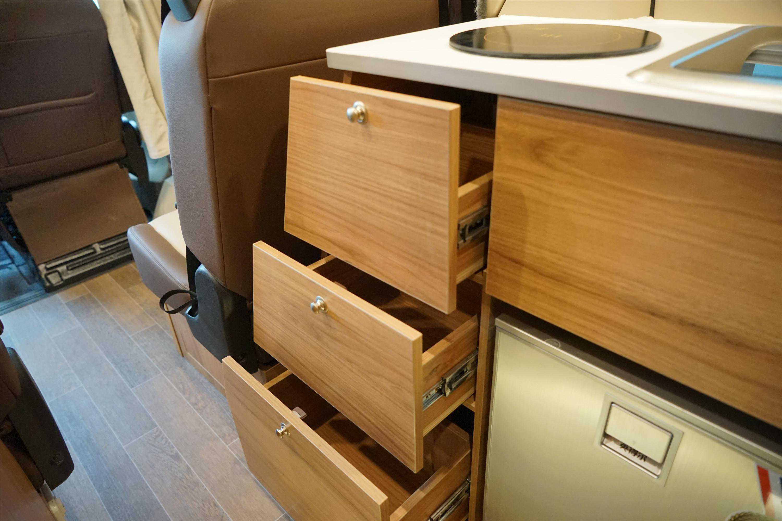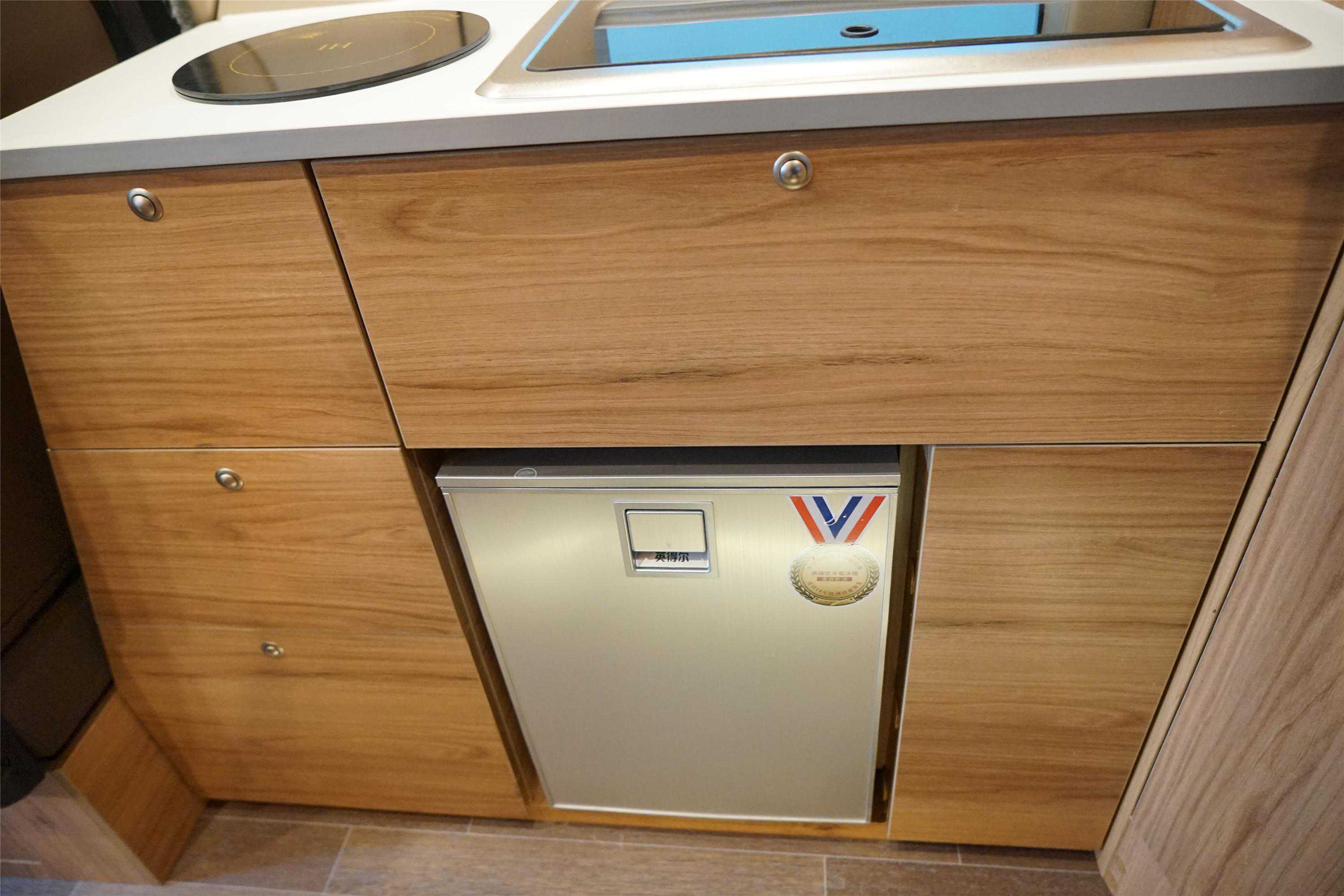 厨房下部集成冰箱、3组储物抽屉、水槽检修舱。