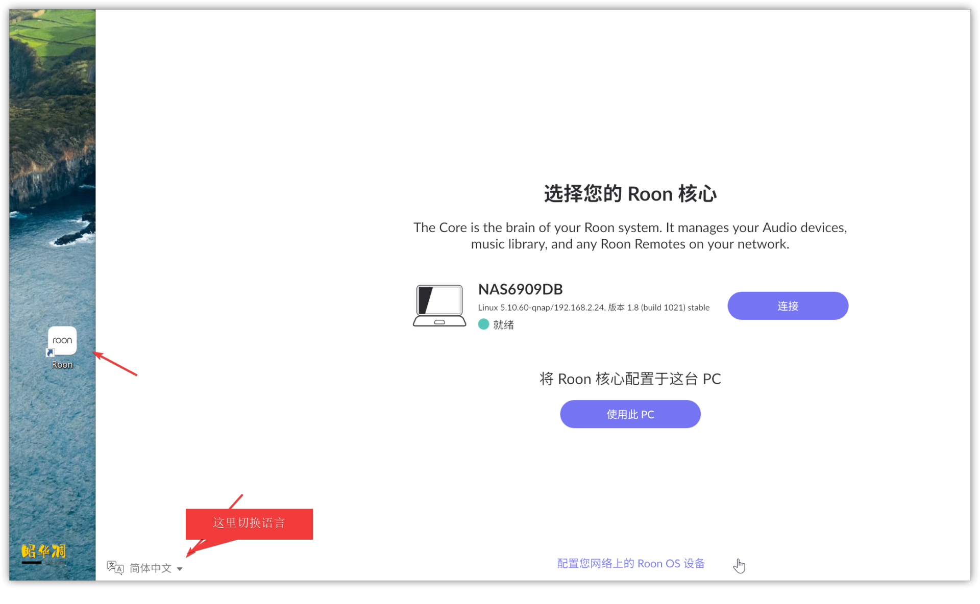 ▼这里我用WindowsPC版展示。启动下载好的roon软件,可以看到已经识别到了我创建的媒体服务器,连接即可。