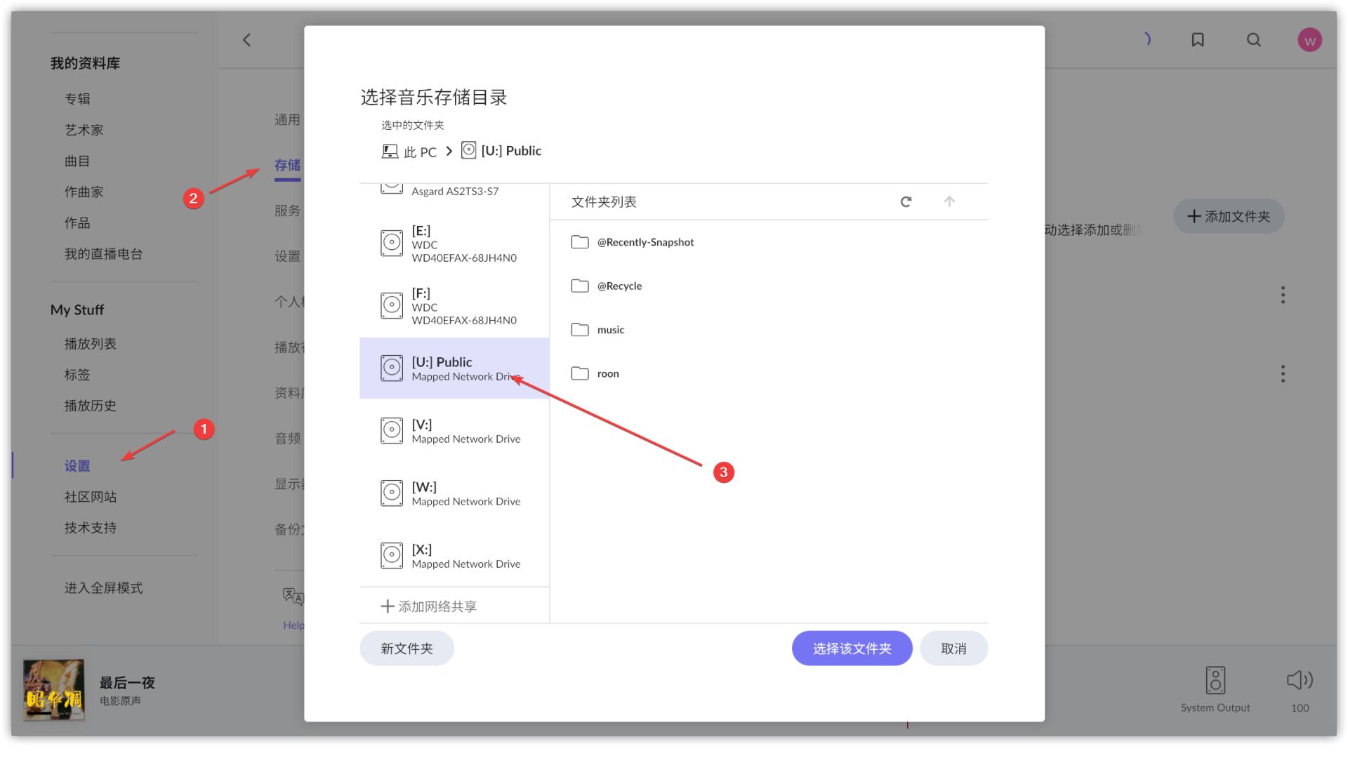 ▼进入后选择存放音乐的文件夹,roon会自动搜索、下载、分类音乐文件。