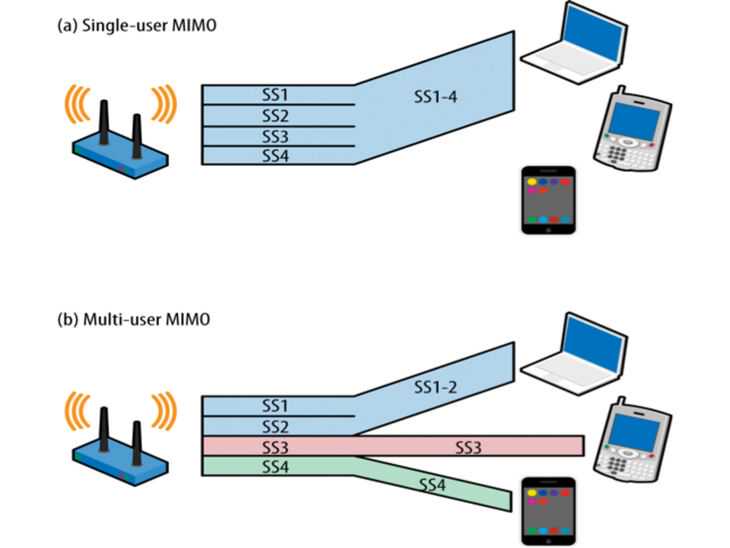 Wi-Fi6全称802.11.ax,不仅传输速率要比Wi-Fi5提升了3倍,并且在多设备并发连接上实现了4倍的容量提升,终端功耗还降低了30%。通俗的来讲,传输速率更快,延迟更低,同时通讯设备更多,终端连接更省电。但是对于支持WiFi6的设备而言,还需要终端设备的配套,这就涉及到另一个关键词【MU-MIMO】。