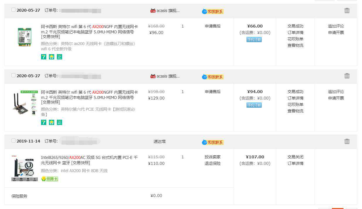 安利完了WiFi6之后,我们还得看完广告看疗效,瞧瞧接入WiFi6之后能够家庭网络环境带来怎样的提升呢?我家之前都是WiFi5的设备,所以我去淘宝上陆陆续续买了3张AX200WiFi6网卡把家里面的2个台式主机和1台笔记本都先做了升级。
