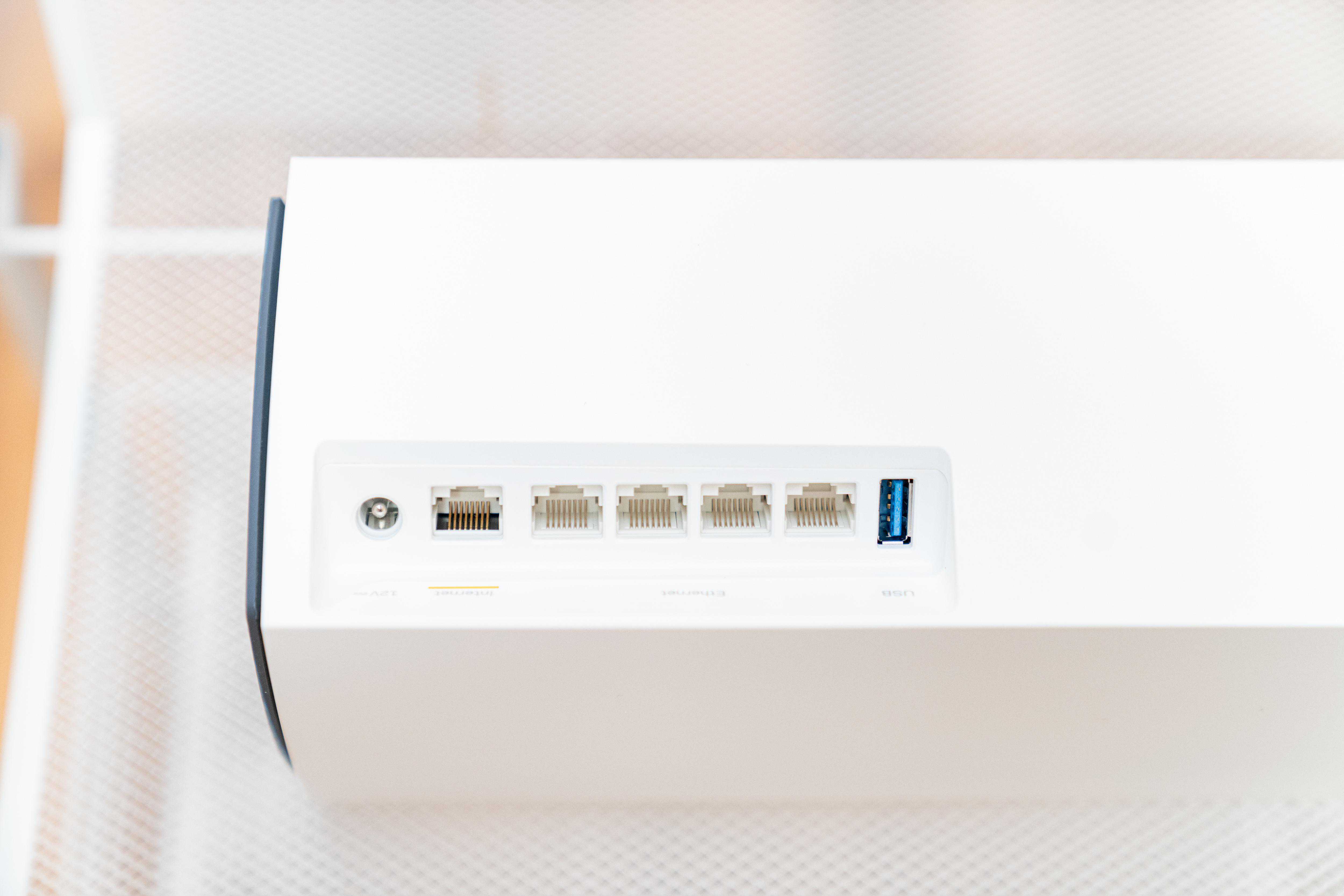 此外,接口的最上方还有一个即插即用的接口,如果外接一个移动硬盘,就能通过路由器的设置,轻松构建高速家庭私有云盘了。