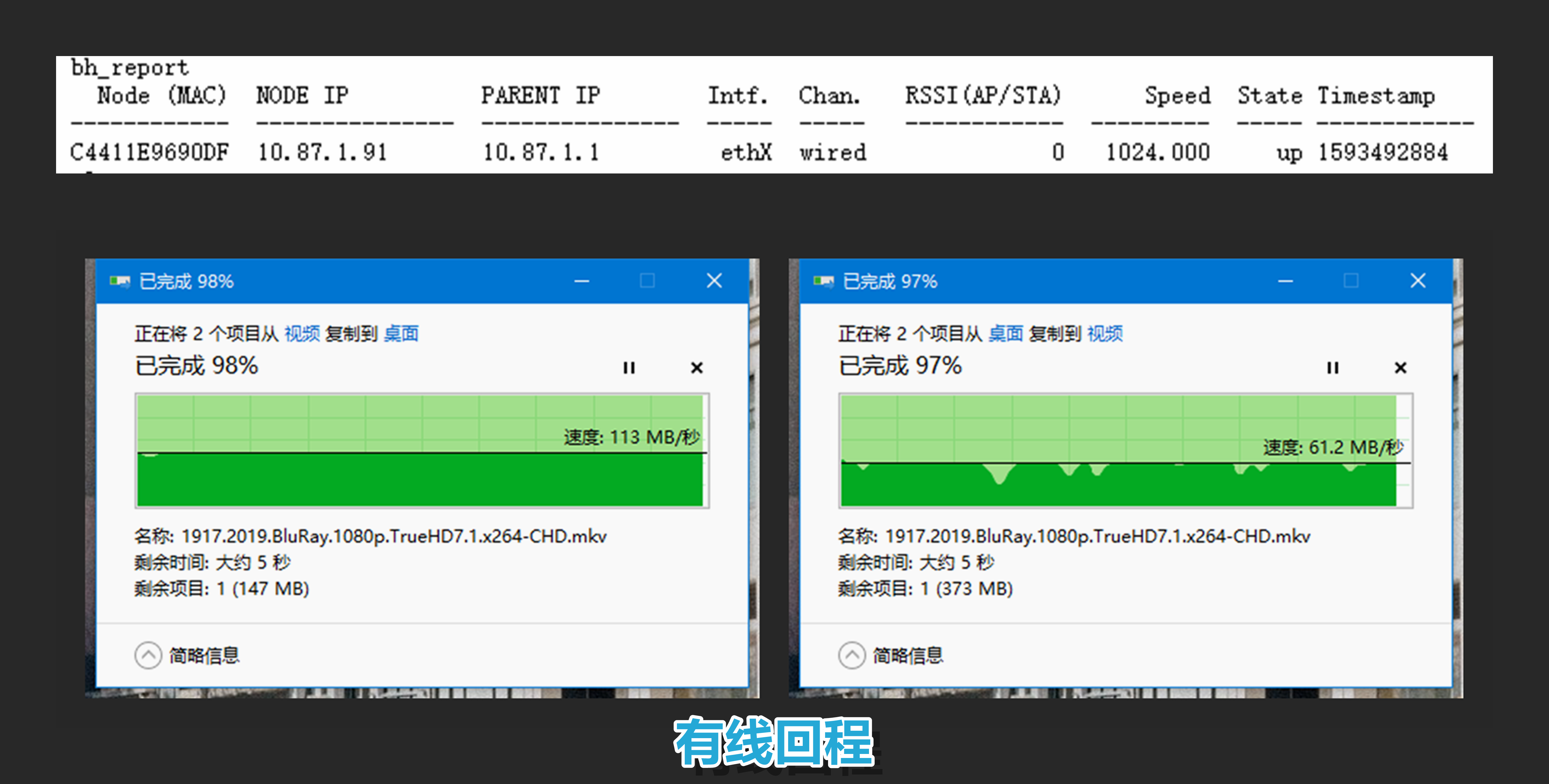 奈何我次卧要用有线网的设备太多,所以我选择了第二种思路:有线回程,我之前从客厅牵了一根10米的七类网线(万兆)就是为了给次卧预留升级。可以看到使用了有线回程之后,从【子节点】NAS→【主节点】笔记本的速率直接跑到113MB/s,从【主节点】笔记本→【子节点】NAS的速率提升到了60MB/s。所以我给大家的建议是装修早铺线,后面多省心,感觉以后我家装新房子都得七类线起步了,每个房间两个万兆网口。