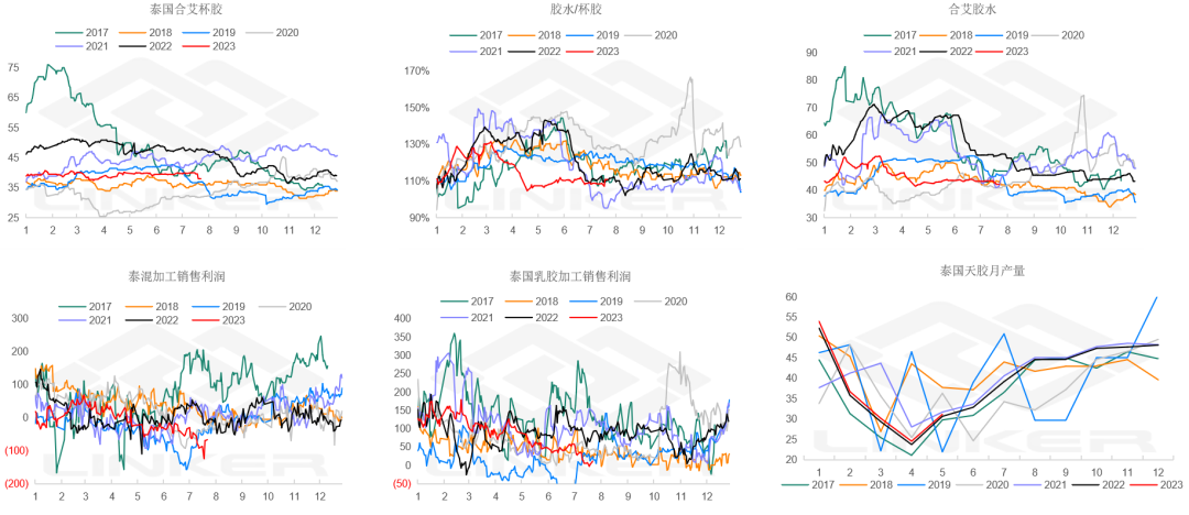 2)深色胶:NR前半周一度参考35铢原料定价,估值明显偏低。07合约摘牌后,08合约无到期仓单,NR开始在套利商平仓买盘推动下小幅反弹,对混合估值基本修复至平水,RU-NR和混合-RU价差也明显压缩。海外供应预期上量,深色胶原料开始补跌,同时美元反弹,SICOM美元计价偏弱,本周小幅走低。