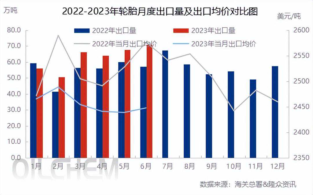 2023年6月,中国轮胎出口量在71.06万吨,环比涨5.15%,同比涨24.17%,1-6月中国轮胎累计出口375.65万吨,累计同比涨13.60%。