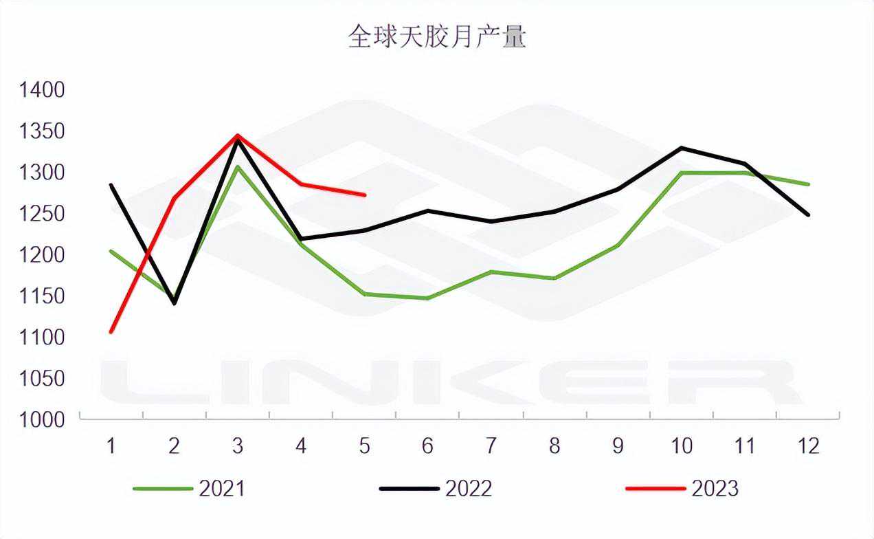 2023年全球天胶产量料同比增加2.5%至1488.8万吨。其中,泰国增2.5%、印尼增1.8%、中国降0.1%、印度增3.8%、越南增0.1%、马来西亚增11.4%、其他国家增2.8%。