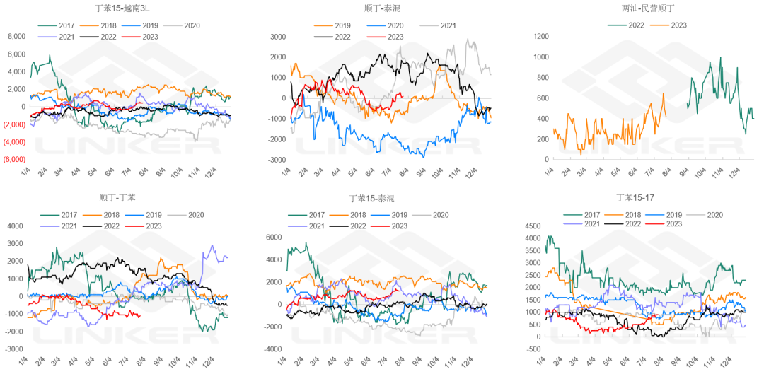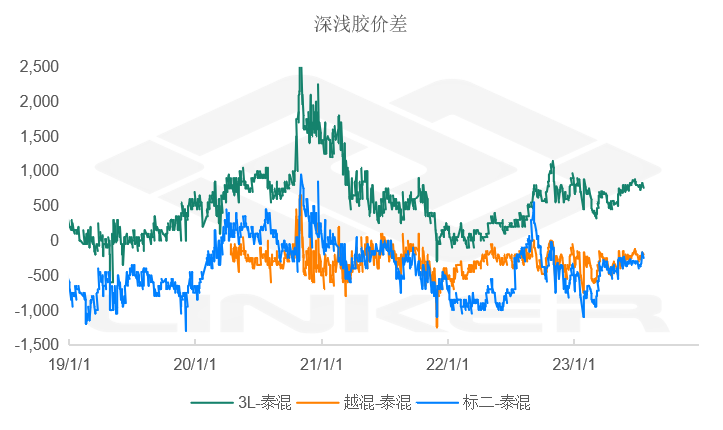 2.需求:国内终端需求变化不大,仍是半钢强、全钢弱、制品淡季的局面。下游利润良好,延续稳开工,轮胎成品库存继续累积。周初行情回调,下游工厂集体补库,混合现货集中成交。海外SPOT订单无明显变化,套利商缺乏建仓意愿,远月船货成交亦有限。