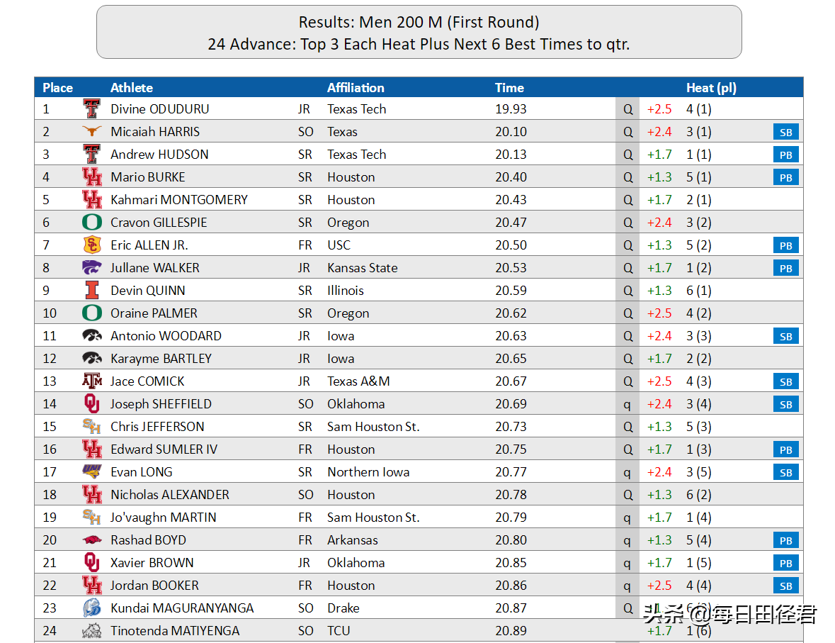 (文/田径君)北京时间5月25日上午,在美国NCCA选拔赛西部赛区男子200米预赛中,尼日利亚22岁小将奥杜杜鲁轻松跑出19秒93(+2.5),位居预赛总排名第一,顺利进入明天的复赛,一个月前奥杜杜鲁已创造19秒76世界赛季第一佳绩,首次打开20秒,现在又跑出19秒93,证明他竞技实力稳定,潜力非凡。
