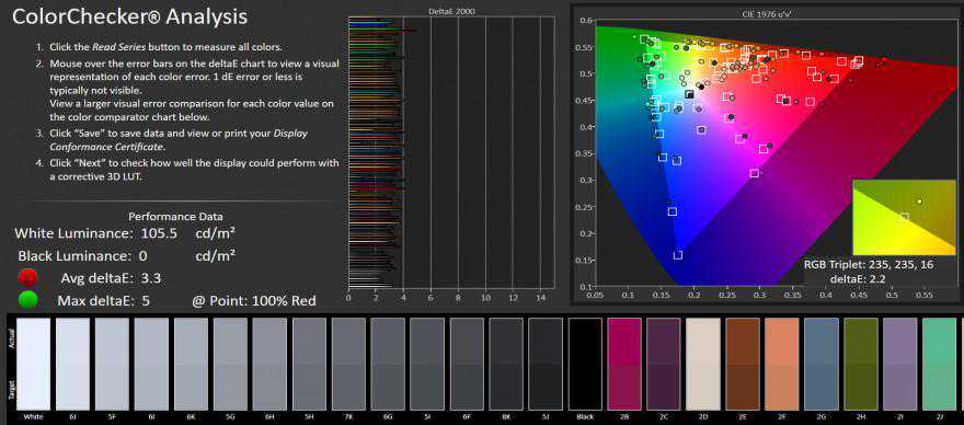 客观参数:亮度很正常,手动全白最高亮度395尼特,局部白色474尼特;自动亮度强光激发,全白最高亮度497尼特,局部白色613尼特;默认色温7677K,标准冷屏。在接近日常使用的100尼特下,平均,最大deltaE5,色准表现还不错。