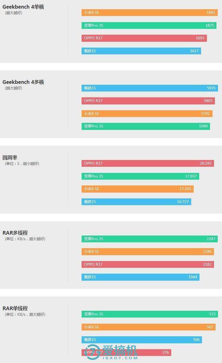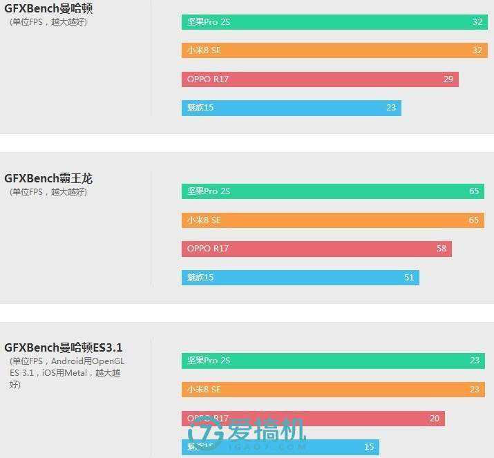 结果没有出现任何意外,坚果Pro2S和小米8SE都是正常的骁龙710,,CPU和GPU部分都在同一个水平,坚果的闪存性能稍强。性能和骁龙670、660呈梯度排列。详细内容可以到爱搞机跑分库查看,这里就不赘述了。