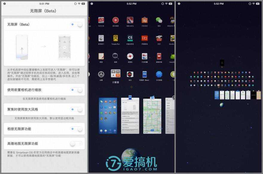 无限屏:类AR的窗口管理工具。好处是可以同屏预览和对比多个应用的信息,操作体验很新鲜。但新鲜劲过去之后,现在这个功能还有点单薄。无限屏模式中的应用不能自定义调序,现在只能在原生图库和高德地图上使用,以后的更多支持需要锤子的适配,场景有限。