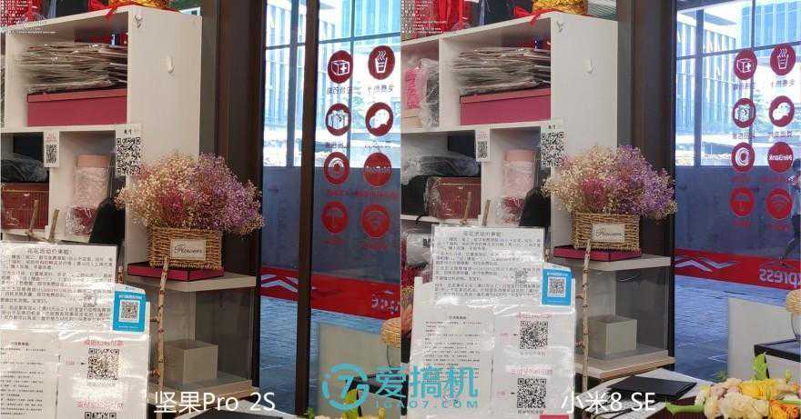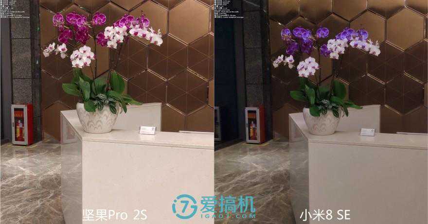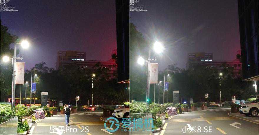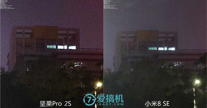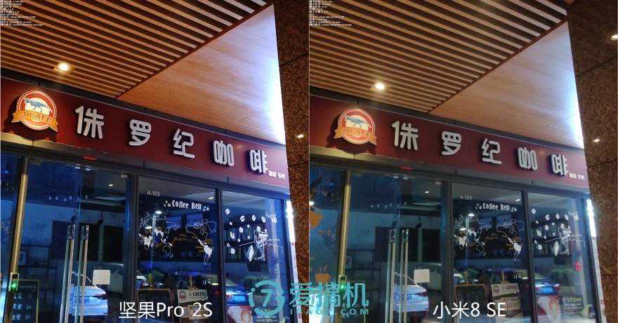 光线变差之后,能一直压小米8SE一头。小米这边测光更加接近肉眼所见的,但无奈抗眩光、白平衡、降噪不争气。坚果的噪点虽然也苍劲有力,但都很细碎。