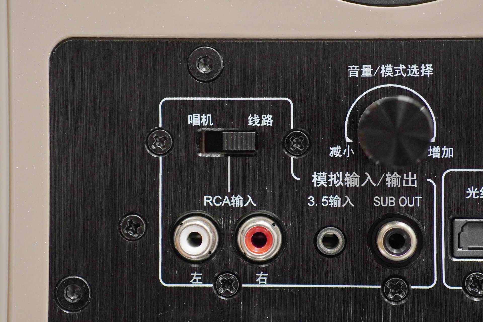 在主箱背面提供了非常丰富的接口,这款HiFi有源音箱的功能相当齐全,除了内置功放外,还设计了黑胶唱放、DAC解码和USB-DAC等功能。