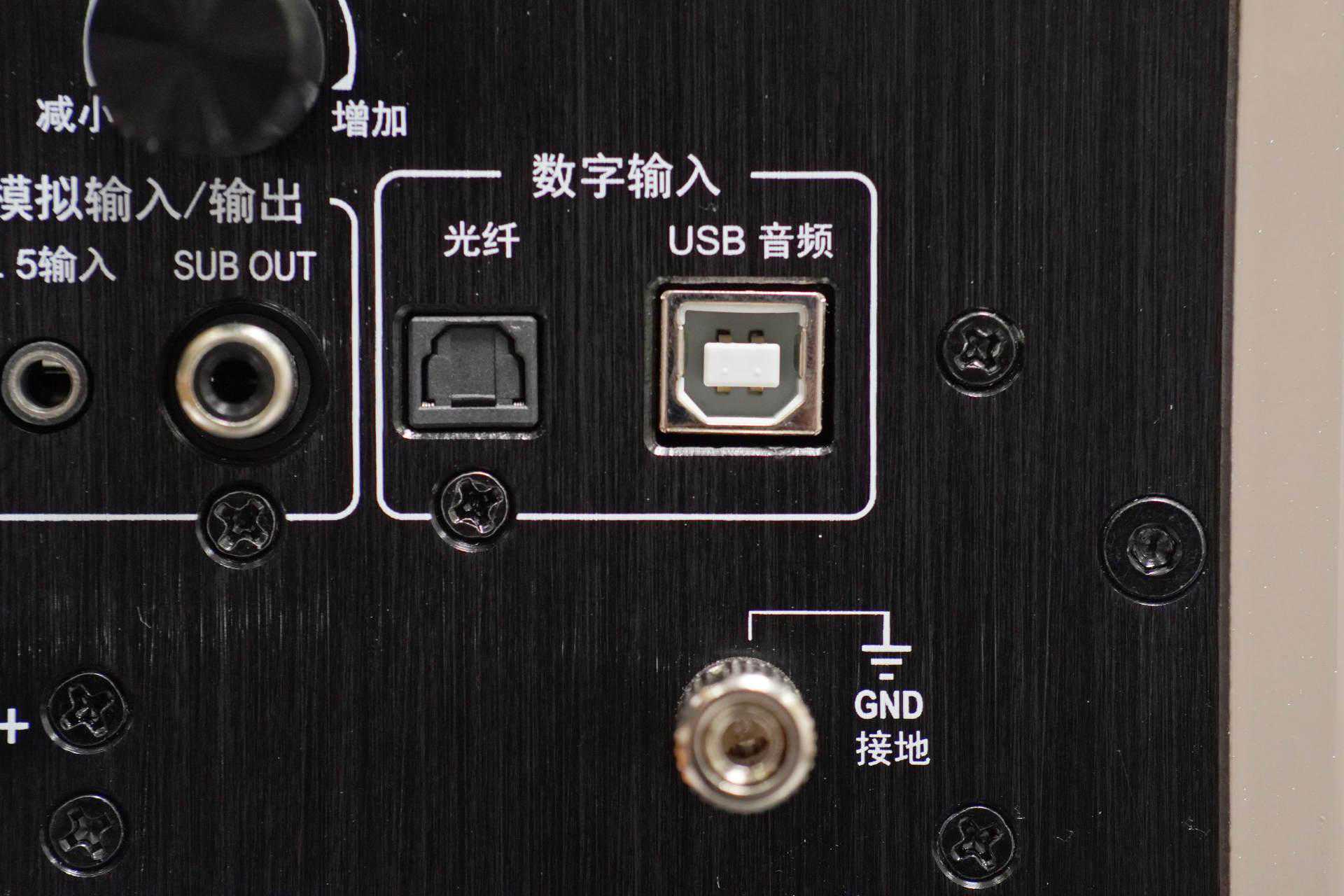 数字输入部分则包含了光纤输入和USB输入,尊宝C707PA内置了DAC解码功能,播放器输出的数字信号用过光纤连接到这款音箱后,通过内部DAC解码电路将数字信号解码为模拟信号再进行放大;而USB接口则可以外接电脑、手机,将数字信号通过USB传输到音箱内部,再经过解码后转换成模拟信号。